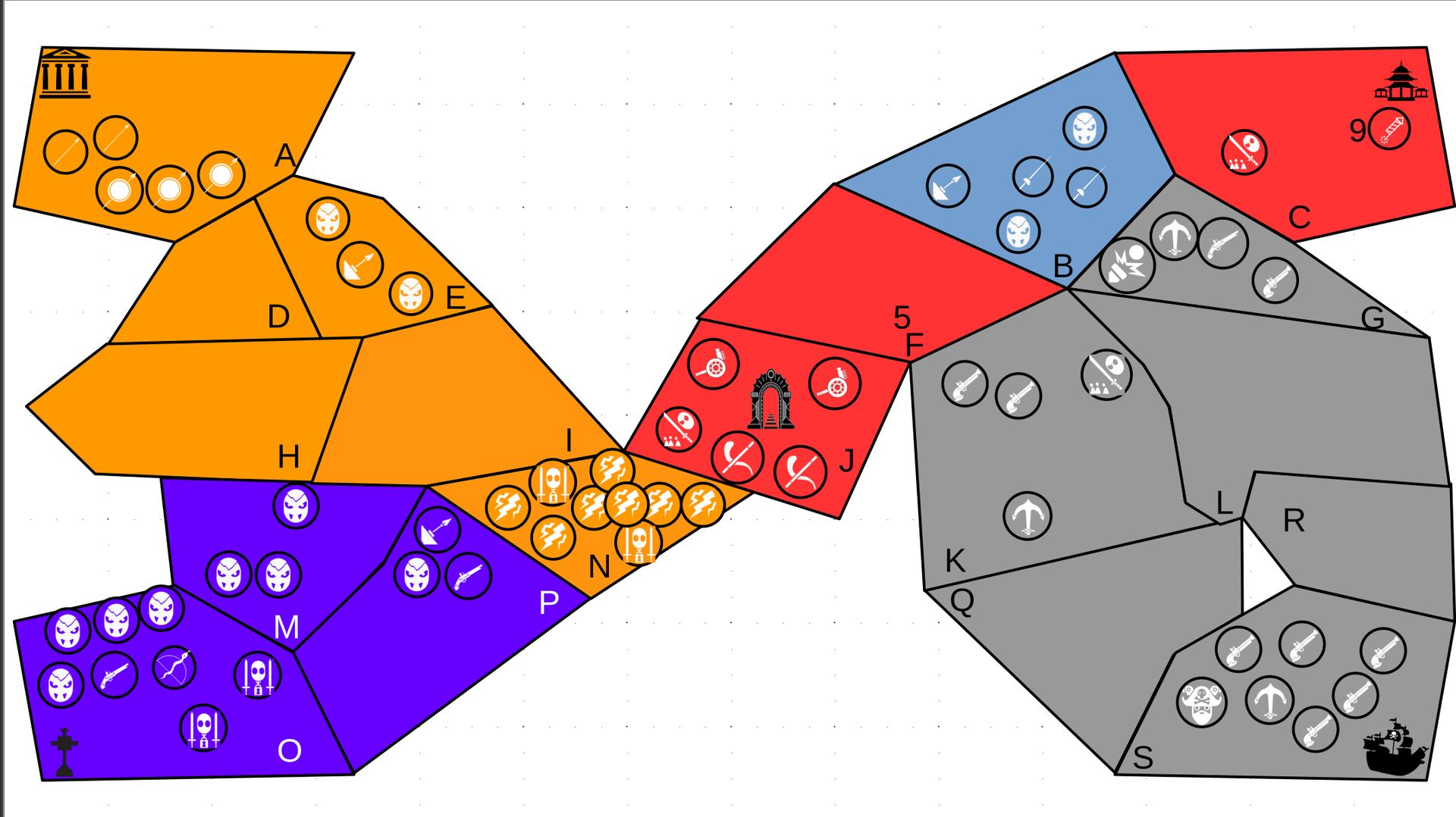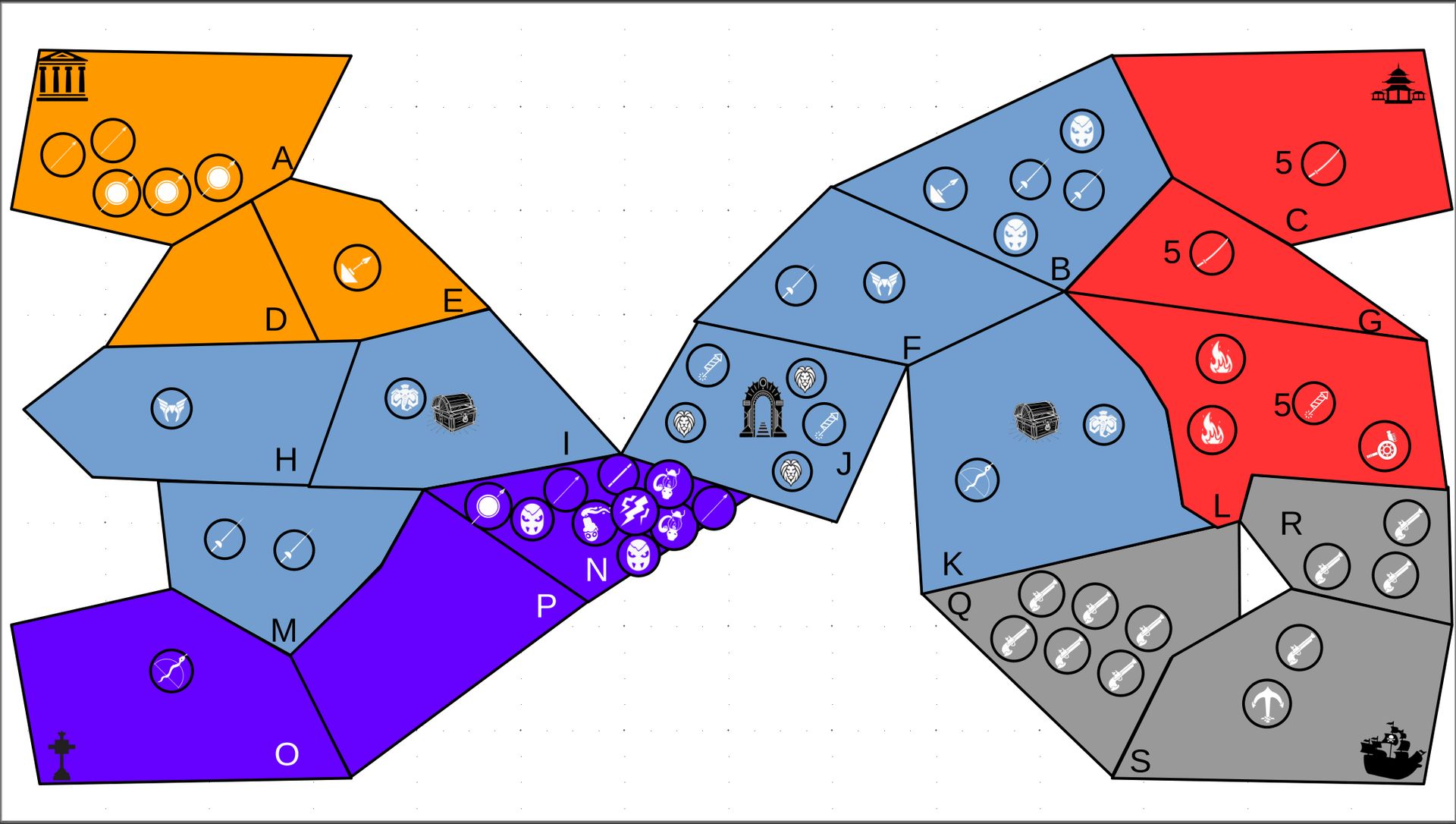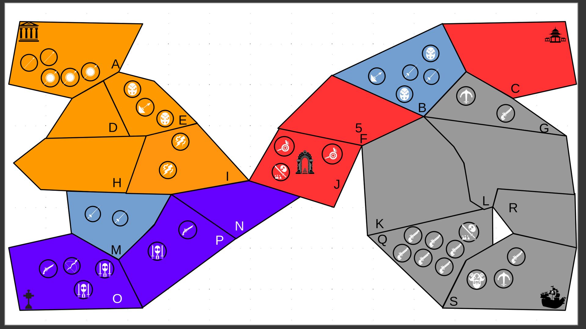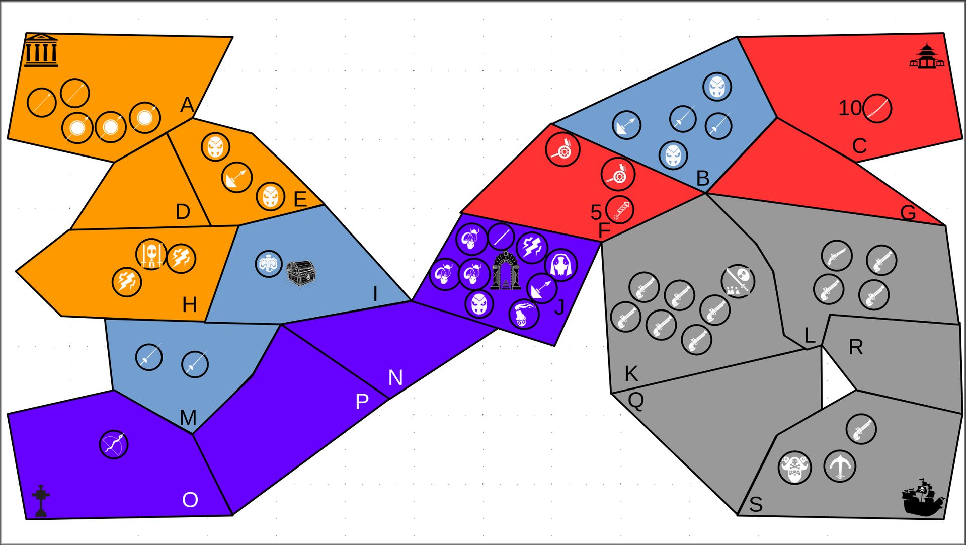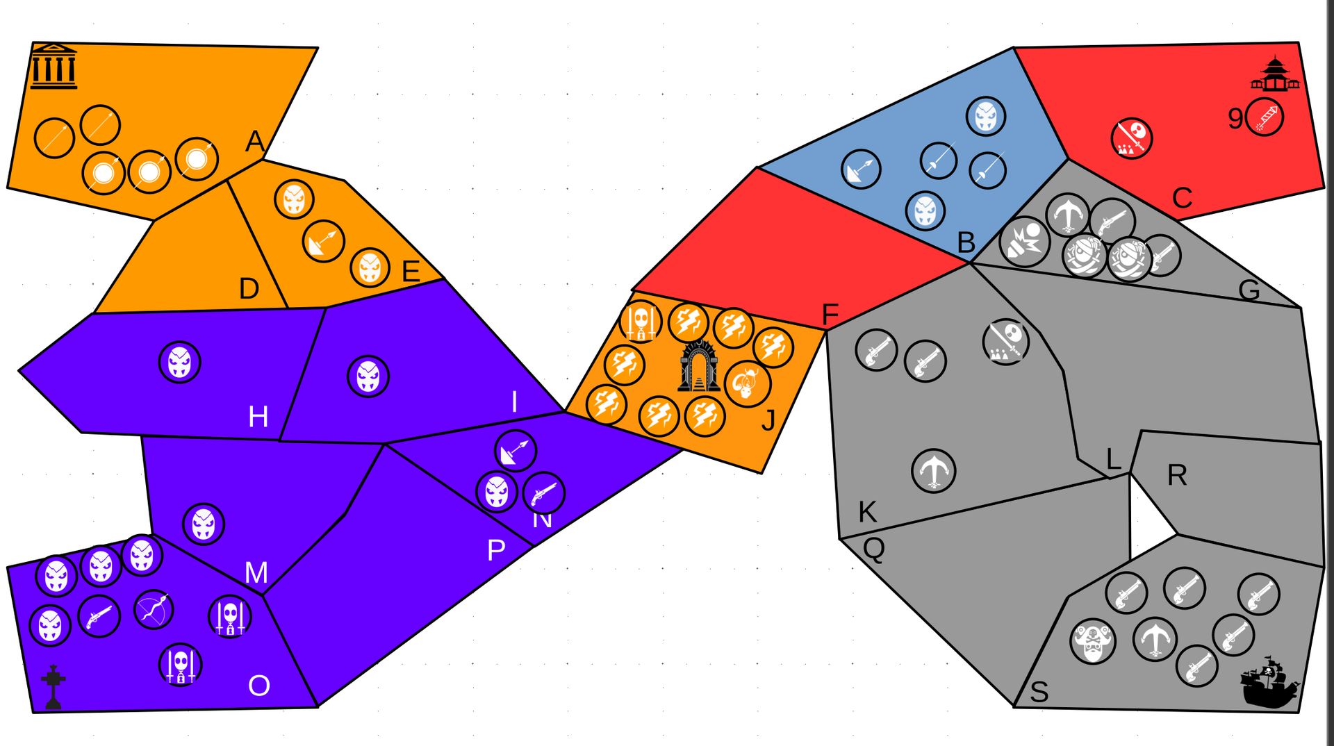 Zuteilung der Fraktionen und Zugreihe: 1. Ano10k - Antike 2. Face- Dynastie 3. Slay - Gruselig 4. SWF - Piraten Spielablauf & Regeln: 1. START-REKRUTIERUNG • erster in Zugreihe fängt an • jeder beginnt mit 3000€ • braucht beliebig viel Geld auf und spart den Rest (wenn nicht alles ausgegeben) für spätere Rekrutierungen • Rekrutierung der fraktionsspezifischen Einheiten (s. Tabelle in Kommis) auf Provinzen (Feldern) in der eigenen Farbe 2. DAS SPIEL [2.a. und 2.b werden übersprungen, wenn 1. der zuletzt ausgeführte Schritt war] 2.a. Einkommen Jeder bekommt das rundenspezifische Einkommen, welches von mir jede Runde deklariert wird und immer mehr wird. Sollte man jedoch seine fraktionsspezifische Hauptstadt (s. Tabelle, Zeichen unter Name der Fraktion) verloren haben, bekommt man nur die Hälfte. 2.b. Rekrutierung • erster in Zugreihe fängt an • braucht beliebig viel Geld auf und spart den Rest (wenn nicht alles ausgegeben) für spätere Rekrutierungen • Rekrutierung der fraktionsspezifischen Einheiten (s. Tabelle in Kommis) auf Provinzen (Feldern) in der eigenen Farbe 2.c. Bewegung - Erster in Zugreihe fängt an - Jede Einheit kann sich auf 1 benachbarte [Kante an Kante] Provinz bewegen - Mehrere Einheiten von einer Provinz können sich zusammen bewegen - Wenn auf Gegnerisches Feld (andere Farbe) gezogen wird: A) Es stehen keine gegnerischen Einheiten drin →Provinz wechselt direkt zu deiner Farbe. War dies die letzte Provinz des Anderen, scheidet der Andere aus dem Spiel aus. B) Es stehen gegnerischen Einheiten drin → Ein Kampf entsteht, der von mir simuliert wird. Mit einer kleinen „Geschichte“ deklariere ich danach das Ergebnis sowie Verluste B.a) der Angreifer gewinnt - der Verteidiger verliert alle Einheiten. Alle überlebenden Einheiten des Angreifers bewegen sich auf die angegriffene Provinz und die Provinz wechselt zu der Farbe des Angreifers. War dies die letzte Provinz des Verteidigers, scheidet er aus dem Spiel aus. B.b) der Verteidiger gewinnt - der Angreifer verliert alle Einheiten. Alle überlebenden Einheiten des Verteidigers bleiben stehen. Keine Provinz wechselt die Farbe. 3. ENDE Das Spiel endet, wenn keiner mehr Lust hat, viele gehen müssen oder nur einer übrig ist. Sollte dies noch nicht der Falls sein, beginnt die Runde wieder bei 2! Ansonsten gewinnt der Mit dem meisten Territorium (bei Gleichstand der mit den meisten Hauptstädten) und wird mit der Anzahl an Siegen in diesem Event (wenn es mehrere gibt) in jedem neuen Event-Beitrag erwähnt.