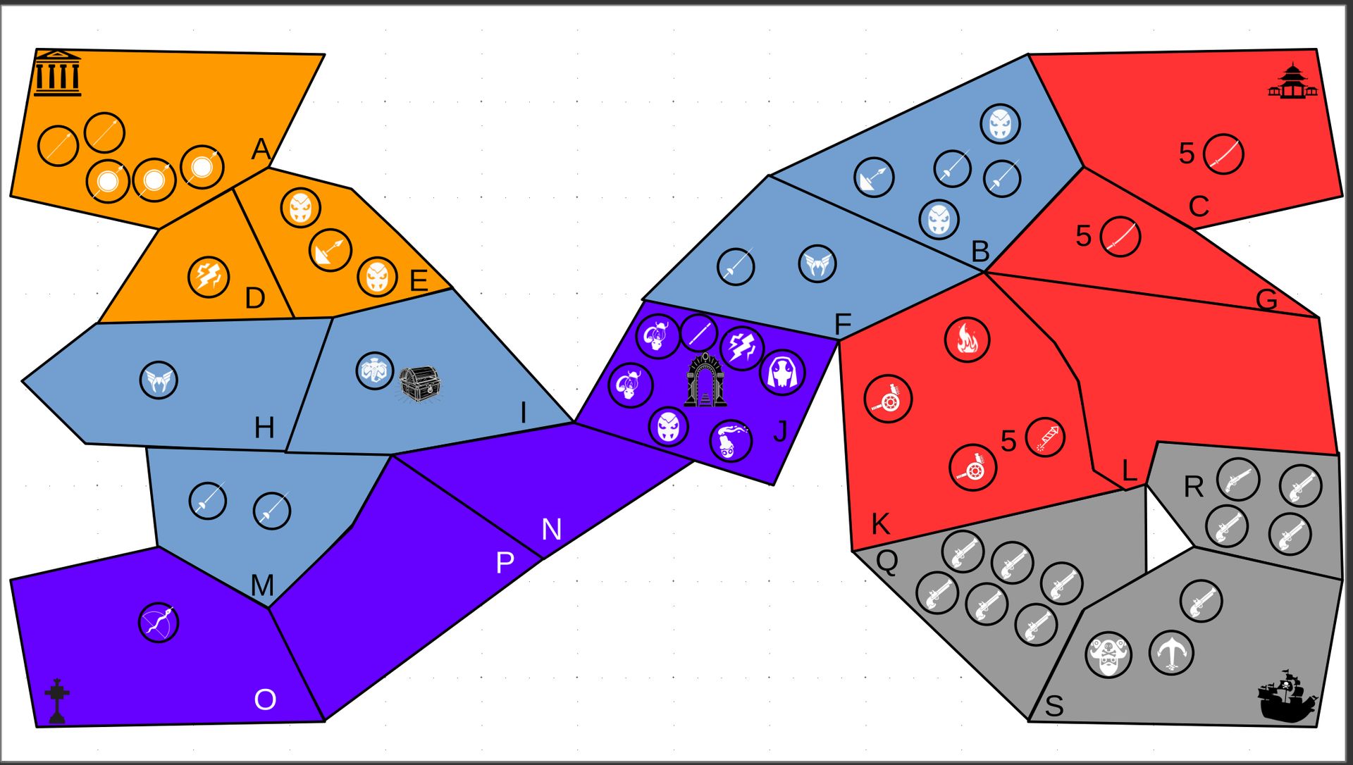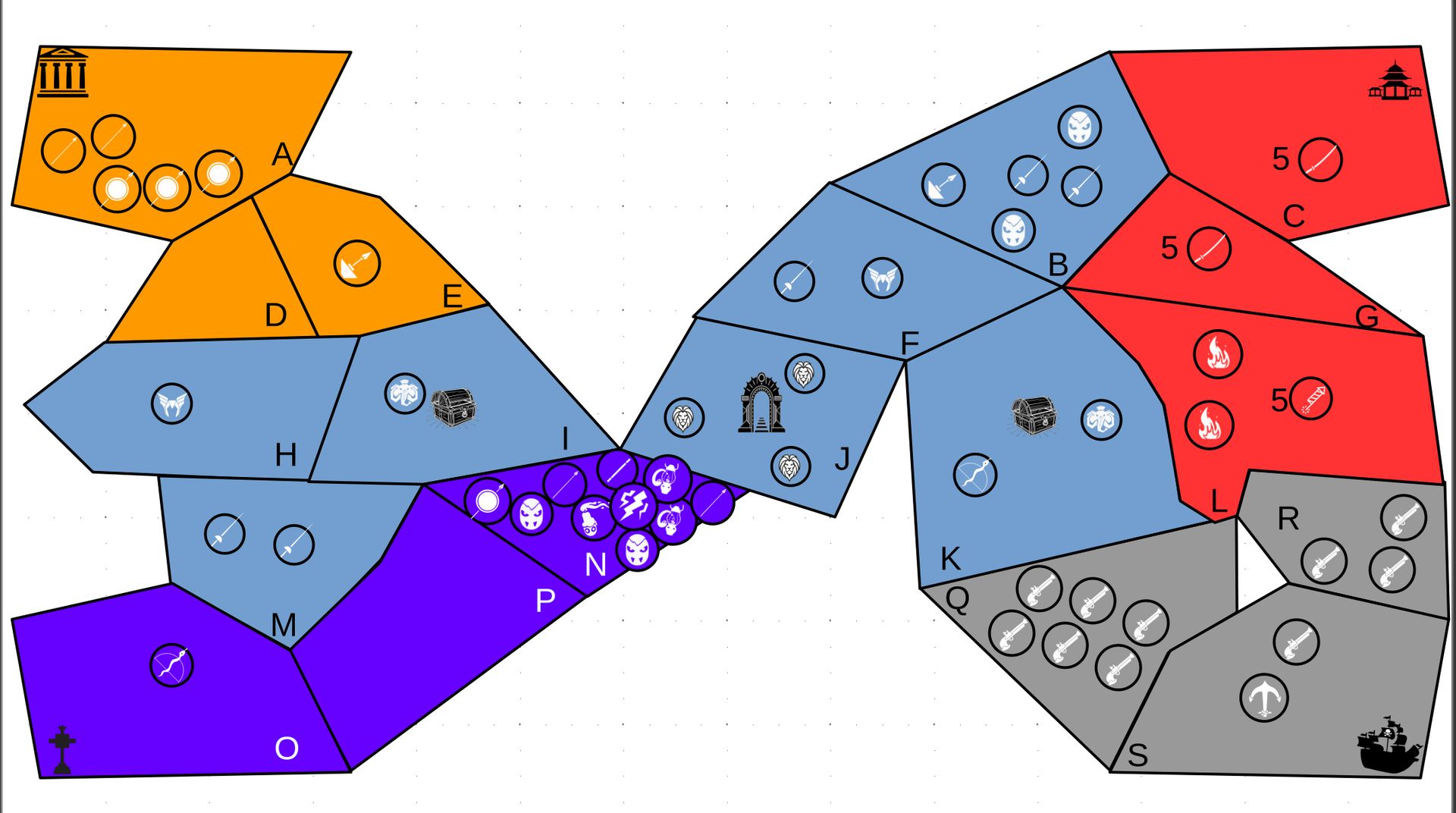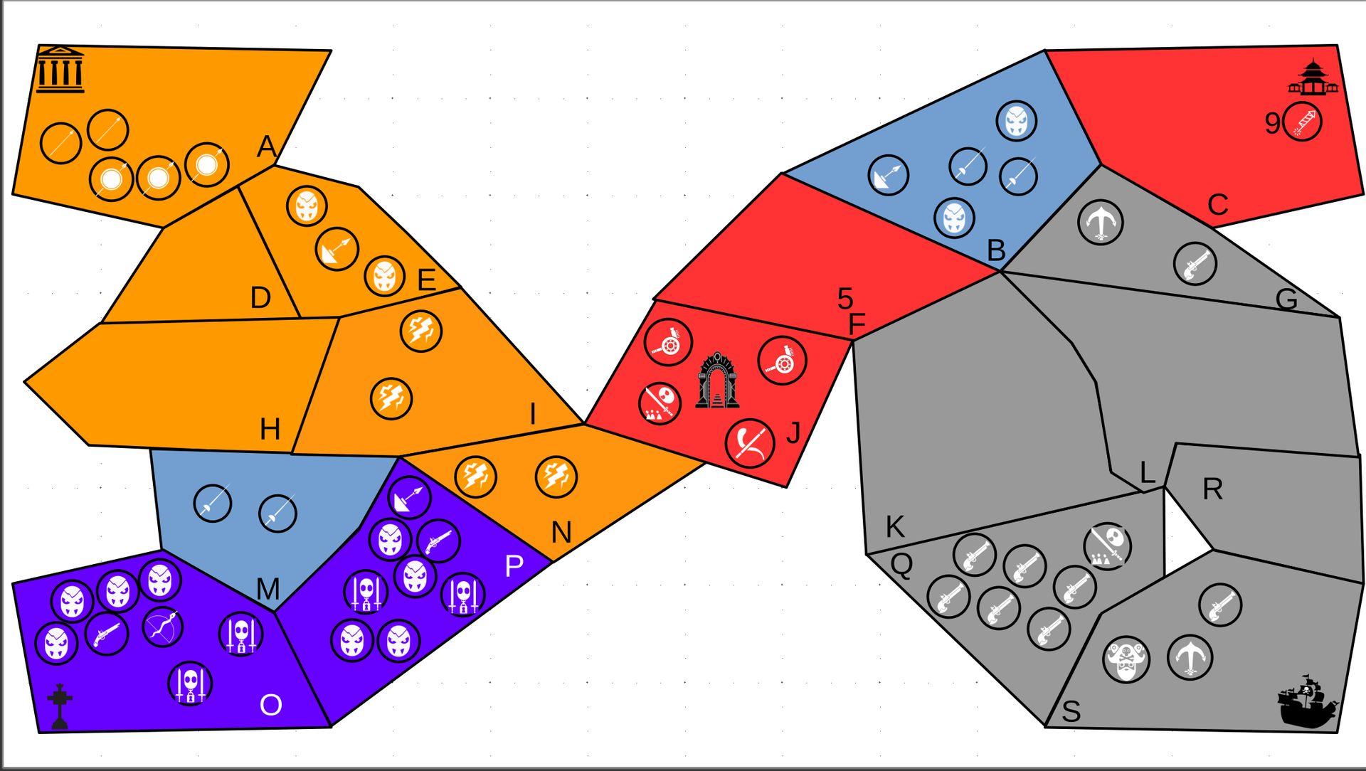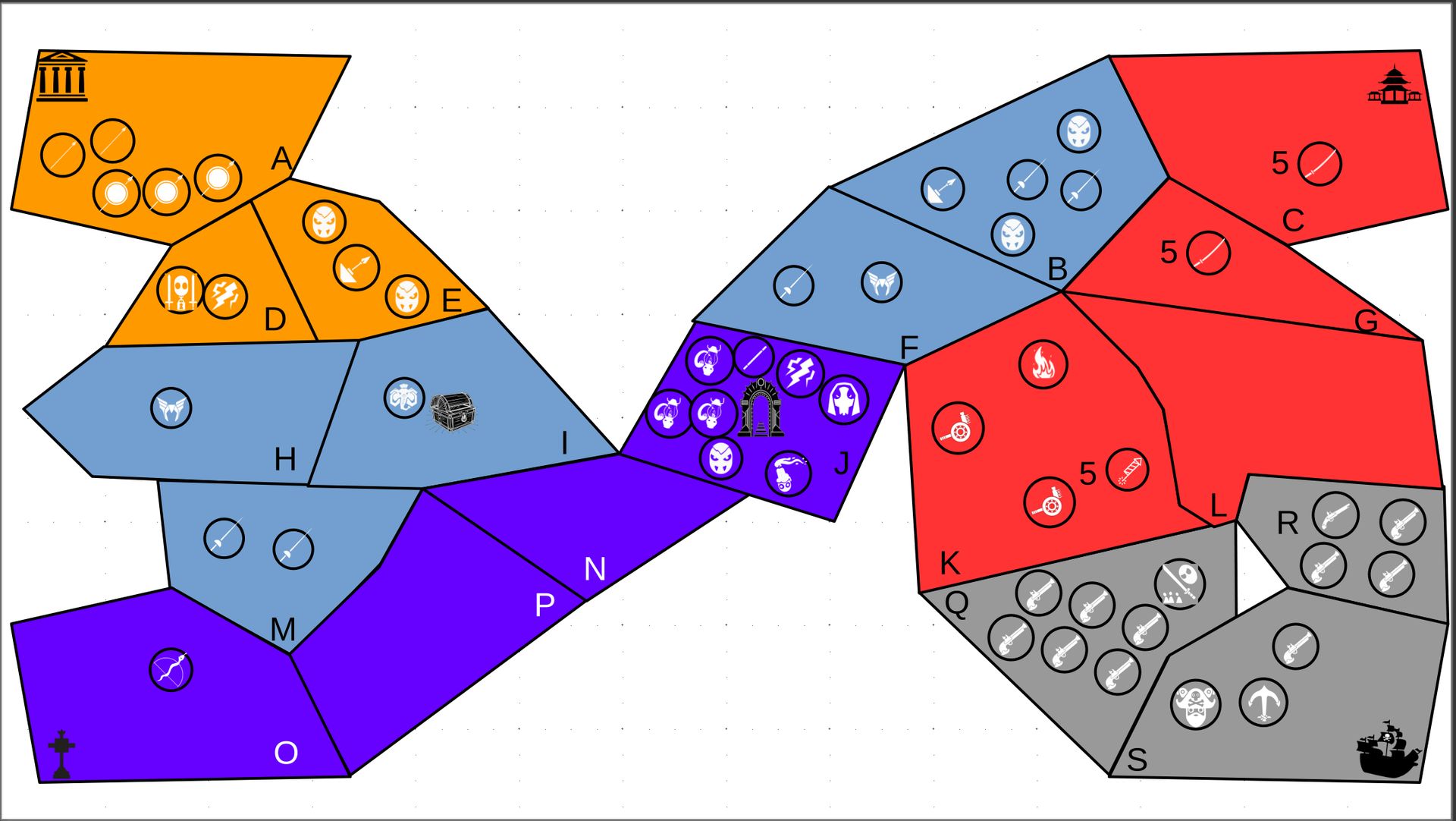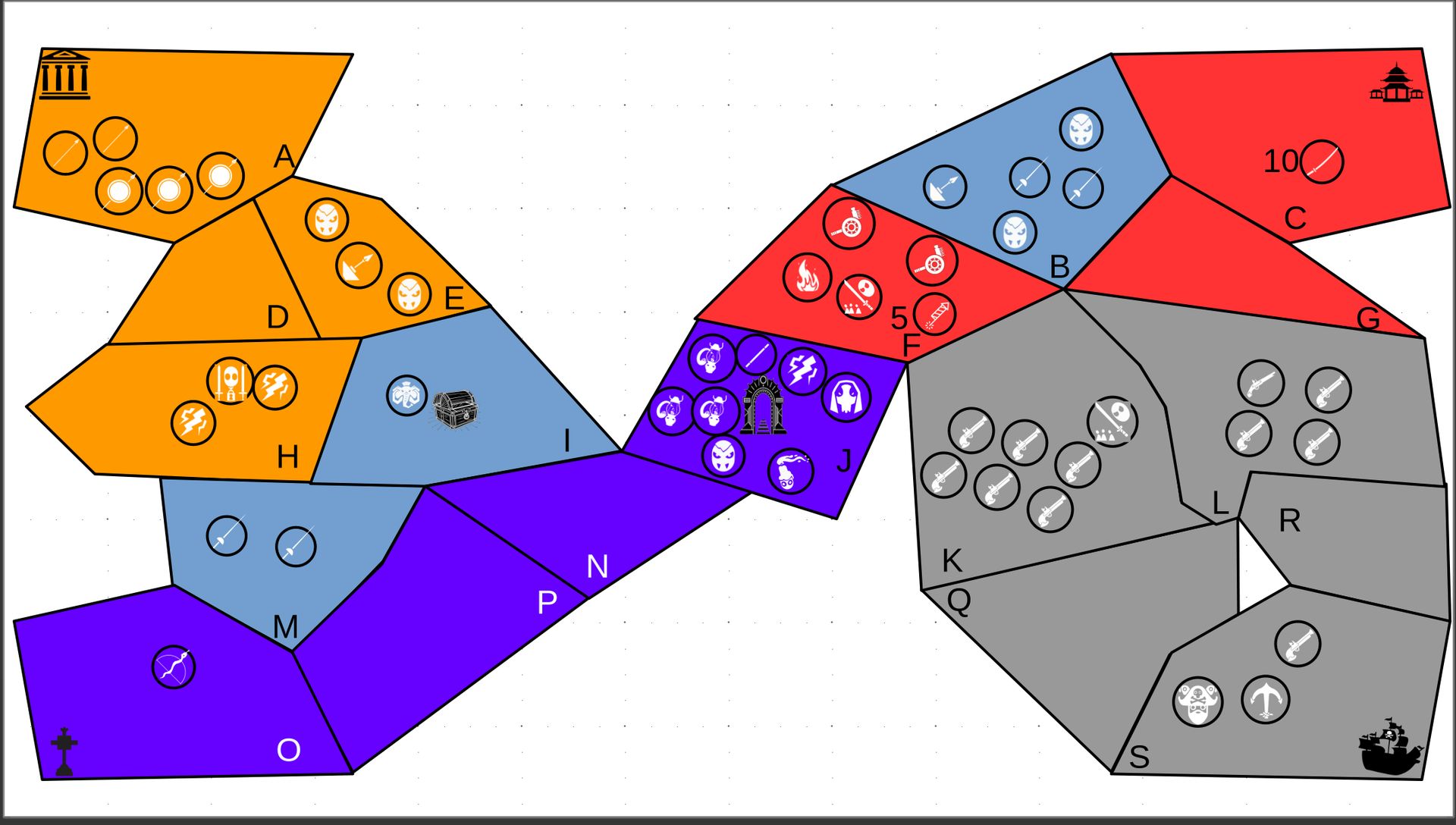 Zuteilung der Fraktionen und Zugreihe: 1. Ano10k - Antike 2. Face- Dynastie 3. Slay - Gruselig 4. SWF - Piraten Spielablauf & Regeln: 1. START-REKRUTIERUNG • erster in Zugreihe fängt an • jeder beginnt mit 3000€ • braucht beliebig viel Geld auf und spart den Rest (wenn nicht alles ausgegeben) für spätere Rekrutierungen • Rekrutierung der fraktionsspezifischen Einheiten (s. Tabelle in Kommis) auf Provinzen (Feldern) in der eigenen Farbe 2. DAS SPIEL [2.a. und 2.b werden übersprungen, wenn 1. der zuletzt ausgeführte Schritt war] 2.a. Einkommen Jeder bekommt das rundenspezifische Einkommen, welches von mir jede Runde deklariert wird und immer mehr wird. Sollte man jedoch seine fraktionsspezifische Hauptstadt (s. Tabelle, Zeichen unter Name der Fraktion) verloren haben, bekommt man nur die Hälfte. 2.b. Rekrutierung • erster in Zugreihe fängt an • braucht beliebig viel Geld auf und spart den Rest (wenn nicht alles ausgegeben) für spätere Rekrutierungen • Rekrutierung der fraktionsspezifischen Einheiten (s. Tabelle in Kommis) auf Provinzen (Feldern) in der eigenen Farbe 2.c. Bewegung - Erster in Zugreihe fängt an - Jede Einheit kann sich auf 1 benachbarte [Kante an Kante] Provinz bewegen - Mehrere Einheiten von einer Provinz können sich zusammen bewegen - Wenn auf Gegnerisches Feld (andere Farbe) gezogen wird: A) Es stehen keine gegnerischen Einheiten drin →Provinz wechselt direkt zu deiner Farbe. War dies die letzte Provinz des Anderen, scheidet der Andere aus dem Spiel aus. B) Es stehen gegnerischen Einheiten drin → Ein Kampf entsteht, der von mir simuliert wird. Mit einer kleinen „Geschichte“ deklariere ich danach das Ergebnis sowie Verluste B.a) der Angreifer gewinnt - der Verteidiger verliert alle Einheiten. Alle überlebenden Einheiten des Angreifers bewegen sich auf die angegriffene Provinz und die Provinz wechselt zu der Farbe des Angreifers. War dies die letzte Provinz des Verteidigers, scheidet er aus dem Spiel aus. B.b) der Verteidiger gewinnt - der Angreifer verliert alle Einheiten. Alle überlebenden Einheiten des Verteidigers bleiben stehen. Keine Provinz wechselt die Farbe. 3. ENDE Das Spiel endet, wenn keiner mehr Lust hat, viele gehen müssen oder nur einer übrig ist. Sollte dies noch nicht der Falls sein, beginnt die Runde wieder bei 2! Ansonsten gewinnt der Mit dem meisten Territorium (bei Gleichstand der mit den meisten Hauptstädten) und wird mit der Anzahl an Siegen in diesem Event (wenn es mehrere gibt) in jedem neuen Event-Beitrag erwähnt.