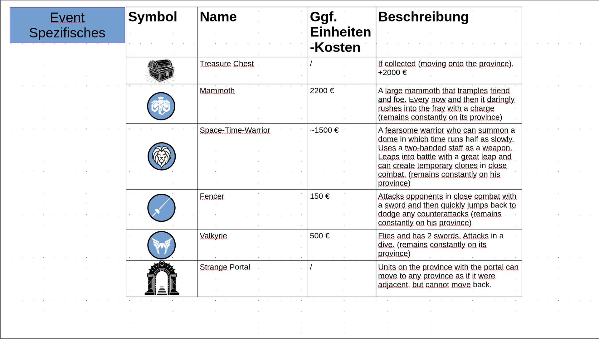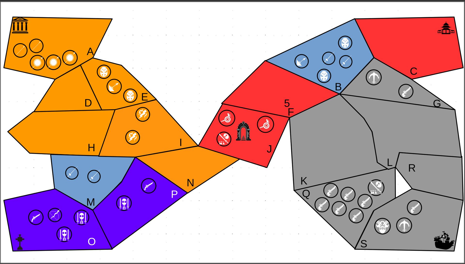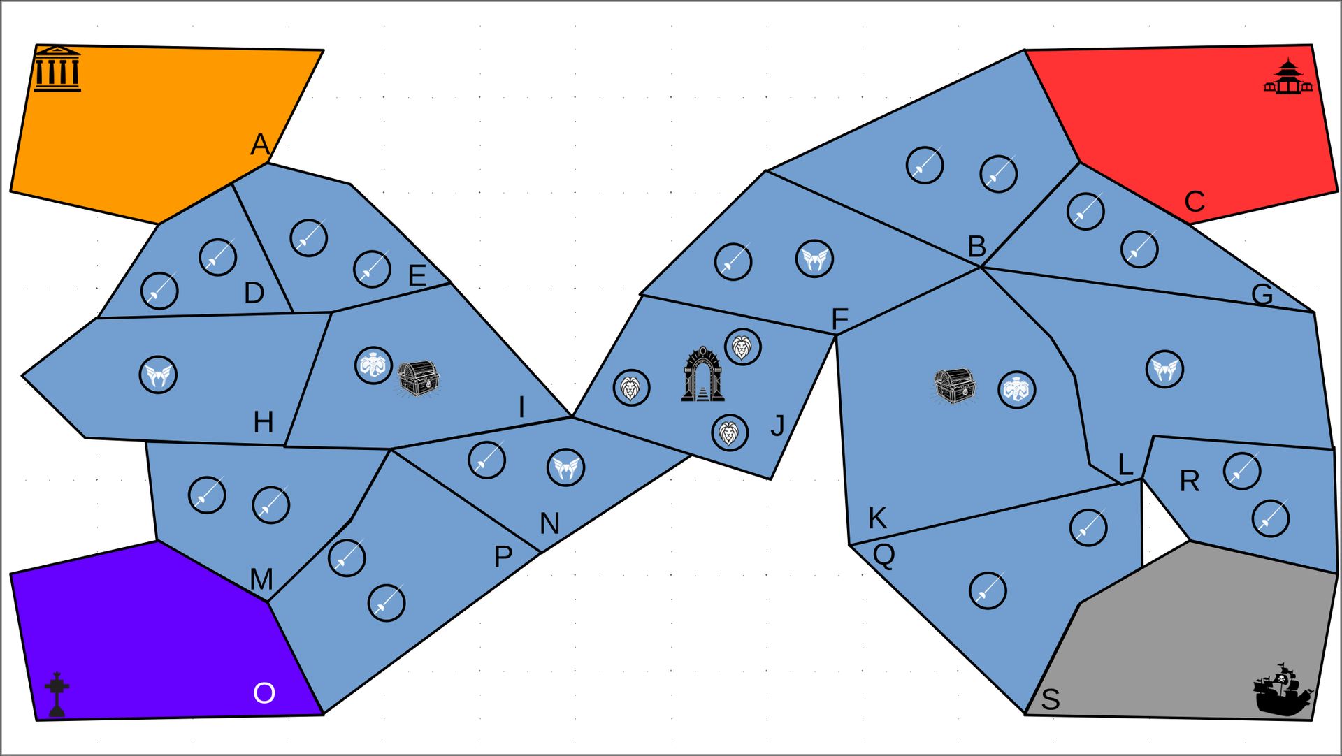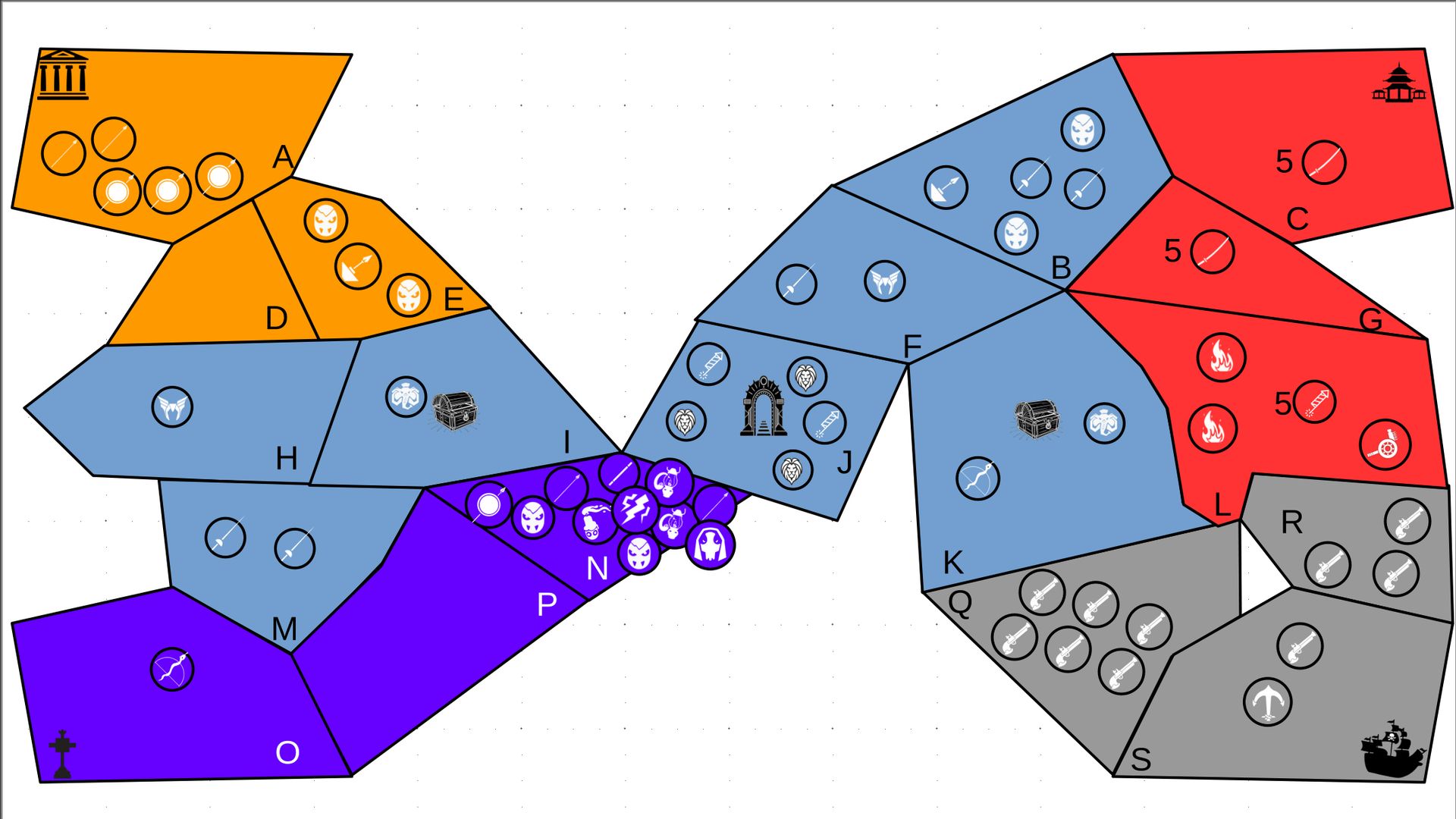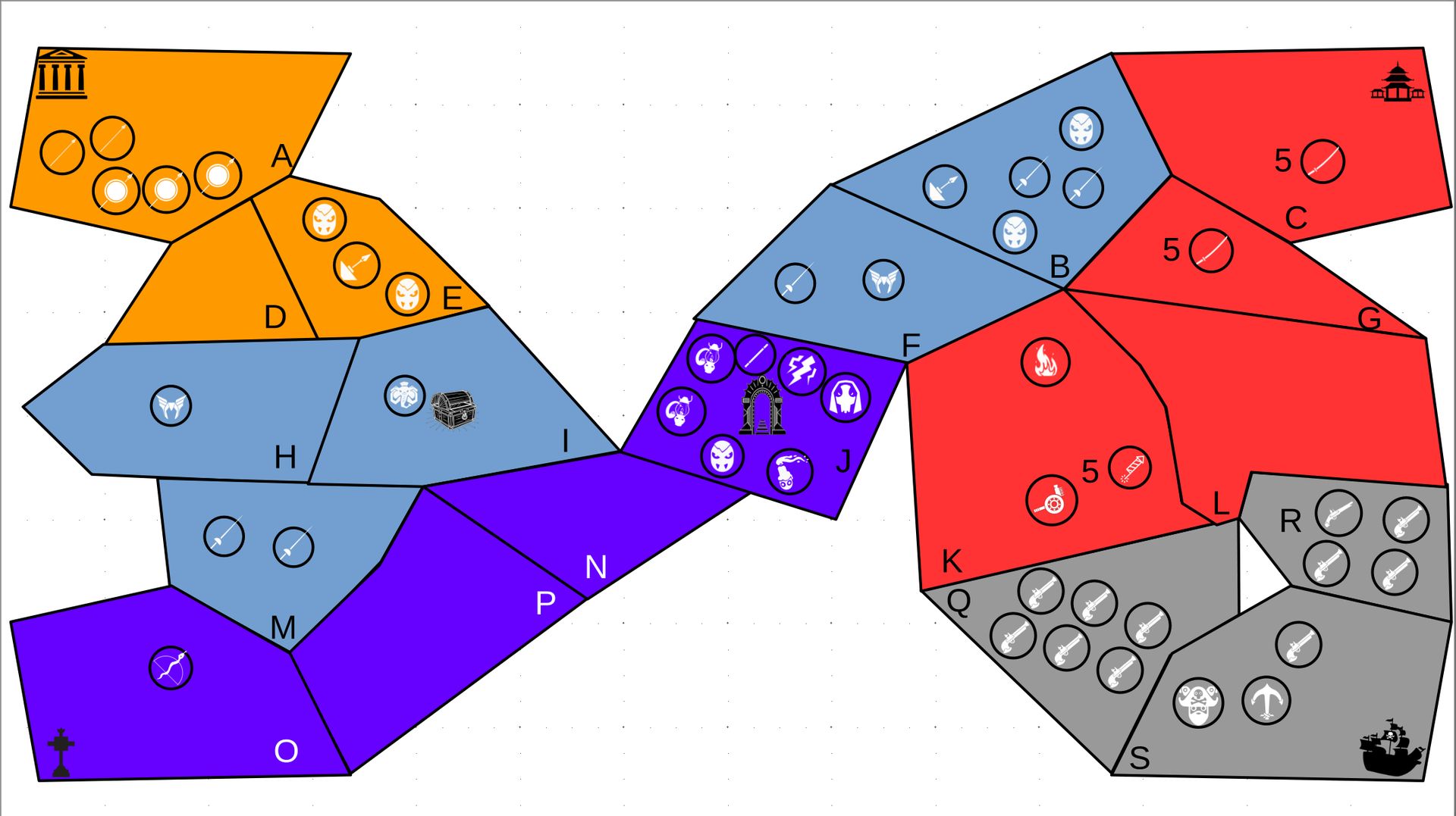Zuteilung der Fraktionen und Zugreihe: 1. Ano10k - Antike 2. Face- Dynastie 3. Slay - Gruselig 4. SWF - Piraten Spielablauf & Regeln: 1. START-REKRUTIERUNG • erster in Zugreihe fängt an • jeder beginnt mit 3000€ • braucht beliebig viel Geld auf und spart den Rest (wenn nicht alles ausgegeben) für spätere Rekrutierungen • Rekrutierung der fraktionsspezifischen Einheiten (s. Tabelle in Kommis) auf Provinzen (Feldern) in der eigenen Farbe 2. DAS SPIEL [2.a. und 2.b werden übersprungen, wenn 1. der zuletzt ausgeführte Schritt war] 2.a. Einkommen Jeder bekommt das rundenspezifische Einkommen, welches von mir jede Runde deklariert wird und immer mehr wird. Sollte man jedoch seine fraktionsspezifische Hauptstadt (s. Tabelle, Zeichen unter Name der Fraktion) verloren haben, bekommt man nur die Hälfte. 2.b. Rekrutierung • erster in Zugreihe fängt an • braucht beliebig viel Geld auf und spart den Rest (wenn nicht alles ausgegeben) für spätere Rekrutierungen • Rekrutierung der fraktionsspezifischen Einheiten (s. Tabelle in Kommis) auf Provinzen (Feldern) in der eigenen Farbe 2.c. Bewegung - Erster in Zugreihe fängt an - Jede Einheit kann sich auf 1 benachbarte [Kante an Kante] Provinz bewegen - Mehrere Einheiten von einer Provinz können sich zusammen bewegen - Wenn auf Gegnerisches Feld (andere Farbe) gezogen wird: A) Es stehen keine gegnerischen Einheiten drin →Provinz wechselt direkt zu deiner Farbe. War dies die letzte Provinz des Anderen, scheidet der Andere aus dem Spiel aus. B) Es stehen gegnerischen Einheiten drin → Ein Kampf entsteht, der von mir simuliert wird. Mit einer kleinen „Geschichte“ deklariere ich danach das Ergebnis sowie Verluste B.a) der Angreifer gewinnt - der Verteidiger verliert alle Einheiten. Alle überlebenden Einheiten des Angreifers bewegen sich auf die angegriffene Provinz und die Provinz wechselt zu der Farbe des Angreifers. War dies die letzte Provinz des Verteidigers, scheidet er aus dem Spiel aus. B.b) der Verteidiger gewinnt - der Angreifer verliert alle Einheiten. Alle überlebenden Einheiten des Verteidigers bleiben stehen. Keine Provinz wechselt die Farbe. 3. ENDE Das Spiel endet, wenn keiner mehr Lust hat, viele gehen müssen oder nur einer übrig ist. Sollte dies noch nicht der Falls sein, beginnt die Runde wieder bei 2! Ansonsten gewinnt der Mit dem meisten Territorium (bei Gleichstand der mit den meisten Hauptstädten) und wird mit der Anzahl an Siegen in diesem Event (wenn es mehrere gibt) in jedem neuen Event-Beitrag erwähnt.