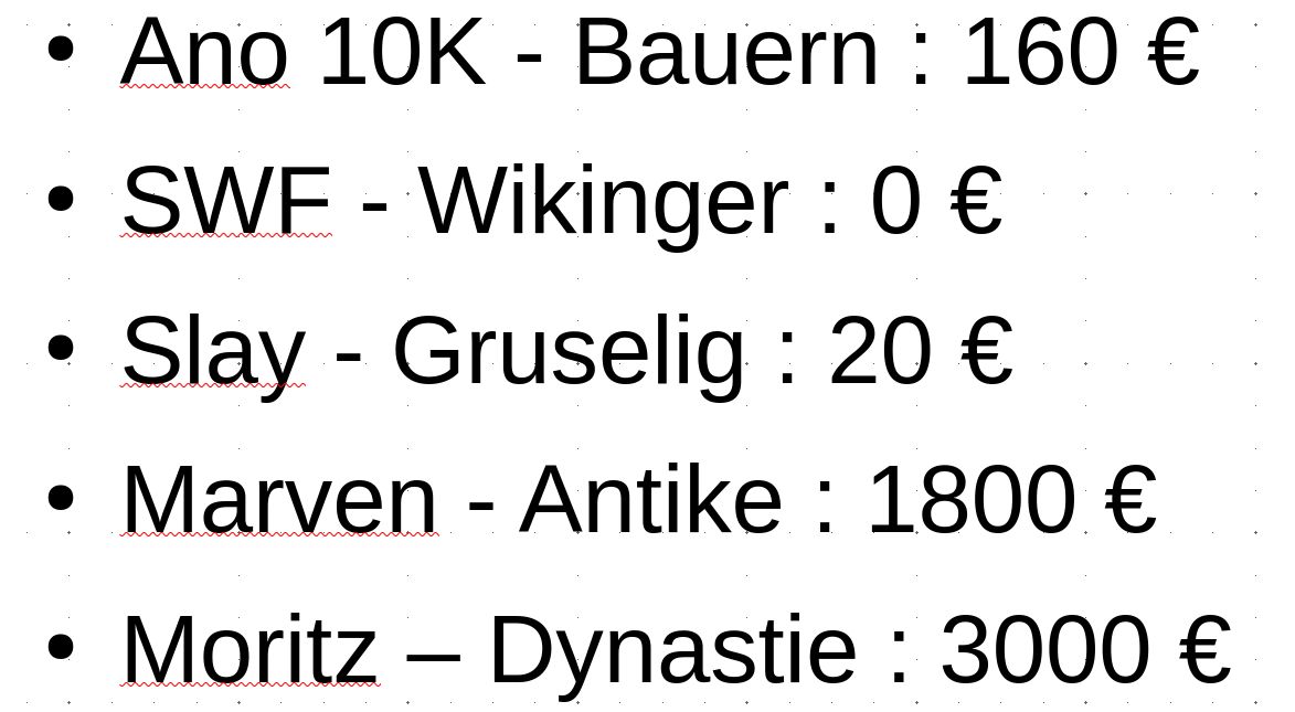 1. Ano 10K – Bauern 2. SWF – Wikinger 3. Slay – Gruselig 4. Moritz – Antike 5. TM – Dynastie 6. Goldi – Mittelalter 7. Irgendetwas – Primitiv