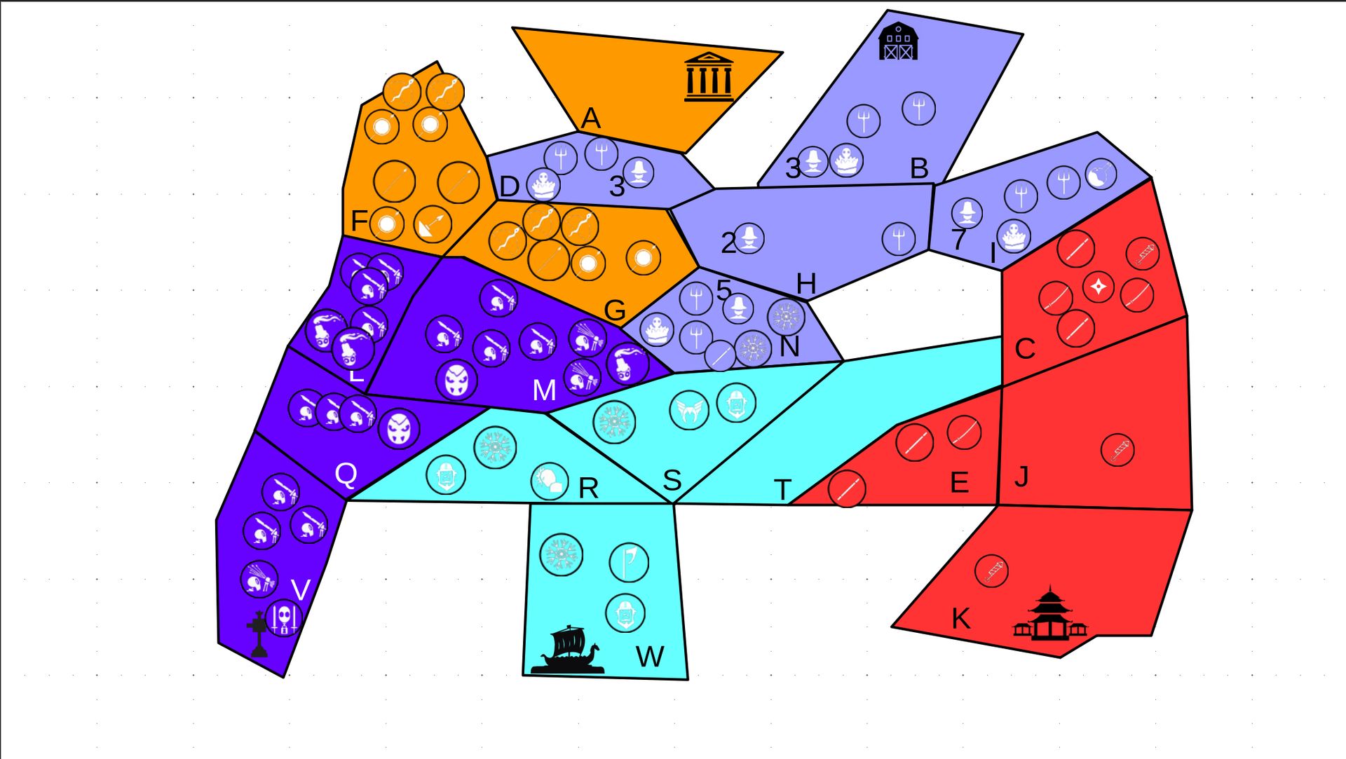 B) Es stehen gegnerischen Einheiten drin → Ein Kampf entsteht, der von mir simuliert wird. Mit einer kleinen „Geschichte“ deklariere ich danach das Ergebnis sowie Verluste B.a) der Angreifer gewinnt - der Verteidiger verliert alle Einheiten. Alle überlebenden Einheiten des Angreifers bewegen sich auf die angegriffene Provinz und die Provinz wechselt zu der Farbe des Angreifers. War dies die letzte Provinz des Verteidigers, scheidet er aus dem Spiel aus. B.b) der Verteidiger gewinnt - der Angreifer verliert alle Einheiten. Alle überlebenden Einheiten des Verteidigers bleiben stehen. Keine Provinz wechselt die Farbe.