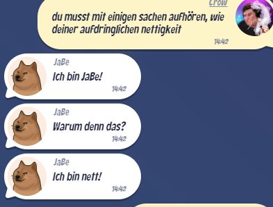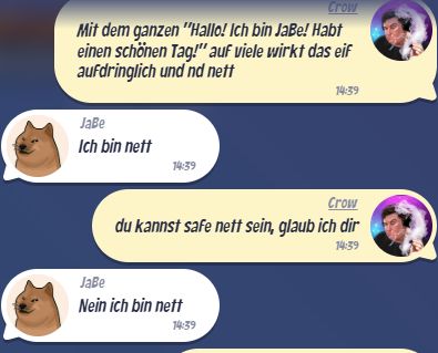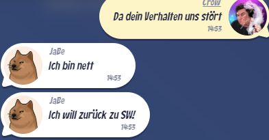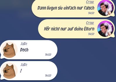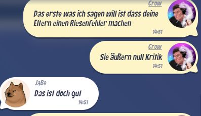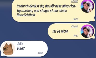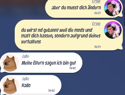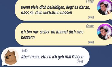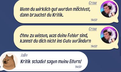 Der Kritiker, also Crow, hat ganz klar gesagt: JaBes Eltern haben alles verbockt, weil sie *null* Kritik äußern und ihm so vormachen, er wäre perfekt. Deswegen hält JaBe sich für den Größten und ist mit seiner "aufdringlichen Nettigkeit" super unbeliebt. Er muss lernen, Kritik anzunehmen, weil seine Eltern schlicht falsch liegen und das *Hauptproblem* sind. Er muss sein Verhalten ändern, nicht weil irgendwer ihn hasst, sondern weil er nervt, sonst wird er immer gebannt. Simpel, Mann. Die Message ist: Ändere dich oder verschwinde.
