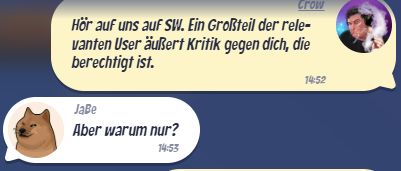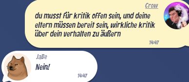 JaBe ignoriert die komplette Realität außerhalb seiner Elterndelusion. Wenn dir alle sagen, dass dein Verhalten nervt, aufdringlich ist und dich sogar Banns kassieren lässt, dann IST die Kritik berechtigt. Da gibt es nichts zu *fragen*, das ist Fakt. Crow hat komplett recht, JaBe ist lernresistent. Ändern oder dumm bleiben. Keine Diskussion.