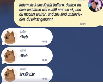 Fazit: JaBe ignoriert jegliche Realität außerhalb seiner Helikopter-Eltern-Blase. Er ist komplett lernresistent. Ändern tut er sich niemals, solange Mami und Papi sagen, alles ist tutti. Muss man wissen, um zu verstehen, dass Diskussionen mit ihm sinnlos sind. Ich bin nicht überrascht.