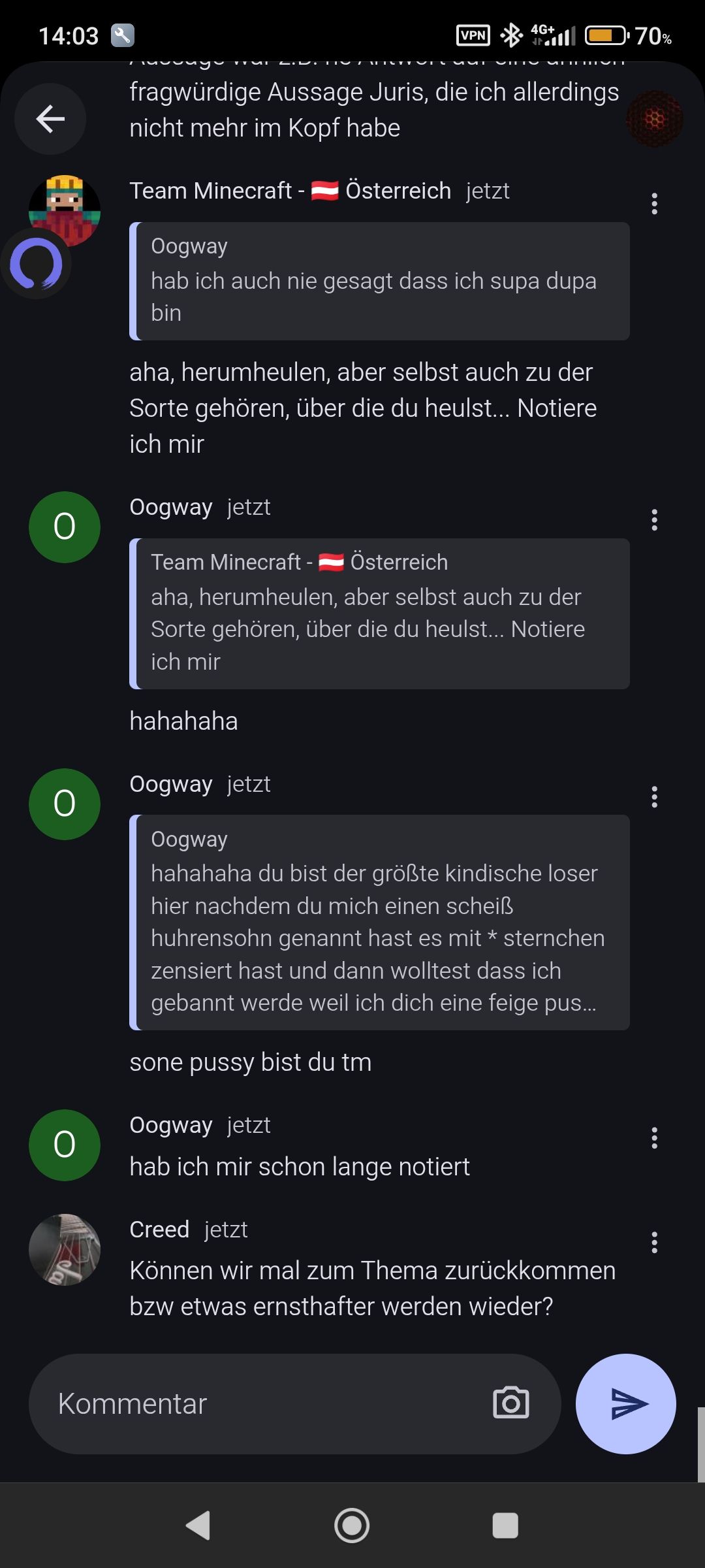 Also die Situation gerade: TM hat mich vor paar Wochen einen Scheiß Huhrensohn genannt wegen einem Argument über Abortion. Er hat in seine Beleidigung aber paar *** sterne eingebaut (man konnte noch immer klar erkennen dass er scheiß hs geschfieben hat) darauf meinte ich du pussy wie feige dass du zensierst