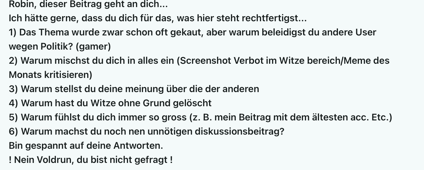 Robin, dieser Beitrag geht an dich... Ich hätte gerne, dass du dich für das, was hier steht rechtfertigst... 1) Das Thema wurde zwar schon oft gekaut, aber warum beleidigst du andere User wegen Politik? (gamer) 2) Warum mischst du dich in alles ein (Screenshot Verbot im Witze bereich/Meme des Monats kritisieren) 3) Warum stellst du deine meinung über die der anderen 4) Warum hast du Witze ohne Grund gelöscht 5) Warum fühlst du dich immer so gross (z. B. mein Beitrag mit dem ältesten acc. Etc.) 6) Warum machst du noch nen unnötigen diskussionsbeitrag? Bin gespannt auf deine Antworten. ! Nein Voldrun, du bist nicht gefragt !