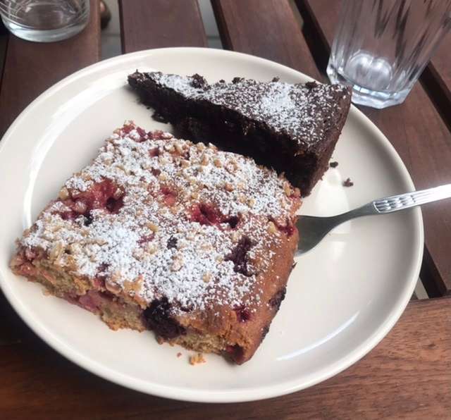 Hier sind ein Stückchen Waldbeerschnitte und Schokokuchen für euch…