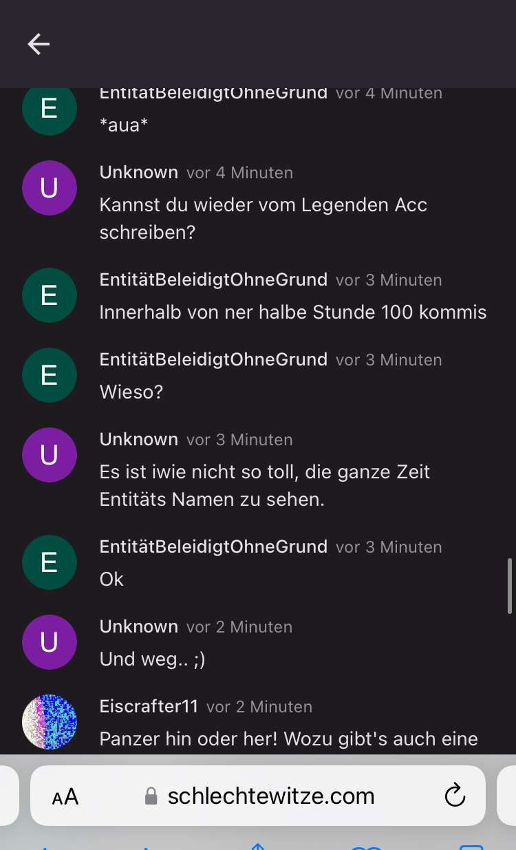 EntitätBeleidigtOhneGrundvor 3 JahrenAber es war doch komplett egal dass sie wussten wer ich bin. Ich denke sie wussten dass ich Enti mag.