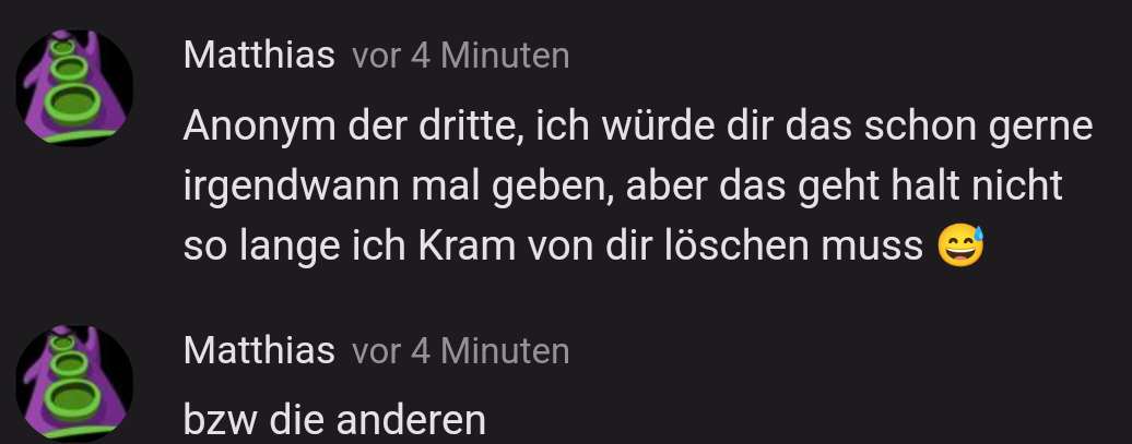 Warum wollt ihr alle die Löschfunktion? Fühlt ihr euch dann besser als andere? Die Löschfunktion bringt euch eigentlich gar nichts. Oder denkt ihr vielleicht, ihr wärt beliebt bei Matthias? Ich würde euch auch, die Funktion geben, damit ihr nicht mehr rum nervt. Warum haben die jetzt so viele? Die Löschfunktion bringt nichts. Nichts. Bettelt bitte nicht darum, es nervt nur, Matthias gibt sie euch, wenn er möchte.