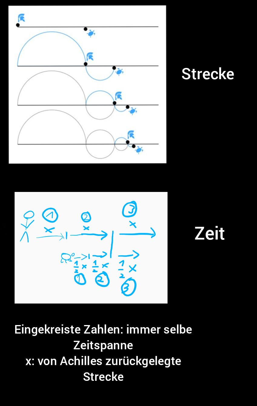 Wenn man die Strecke beobachtet die die Schildkröte zurücklegt und die die Achilles in der Zeit zurücklegt funktioniert es nicht. Aber wenn man eine Zeit nimmt und in der bei jedem immer wieder dieselbe Strecke einfügt überholt Achilles die Schildkröte.