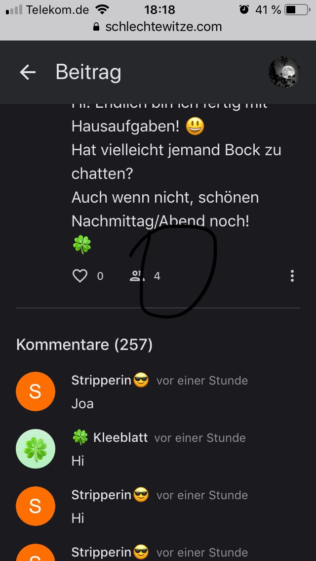 Hi! Endlich bin ich fertig mit Hausaufgaben! 😃 Hat vielleicht jemand Bock zu chatten? Auch wenn nicht, schönen Nachmittag/Abend noch! 🍀