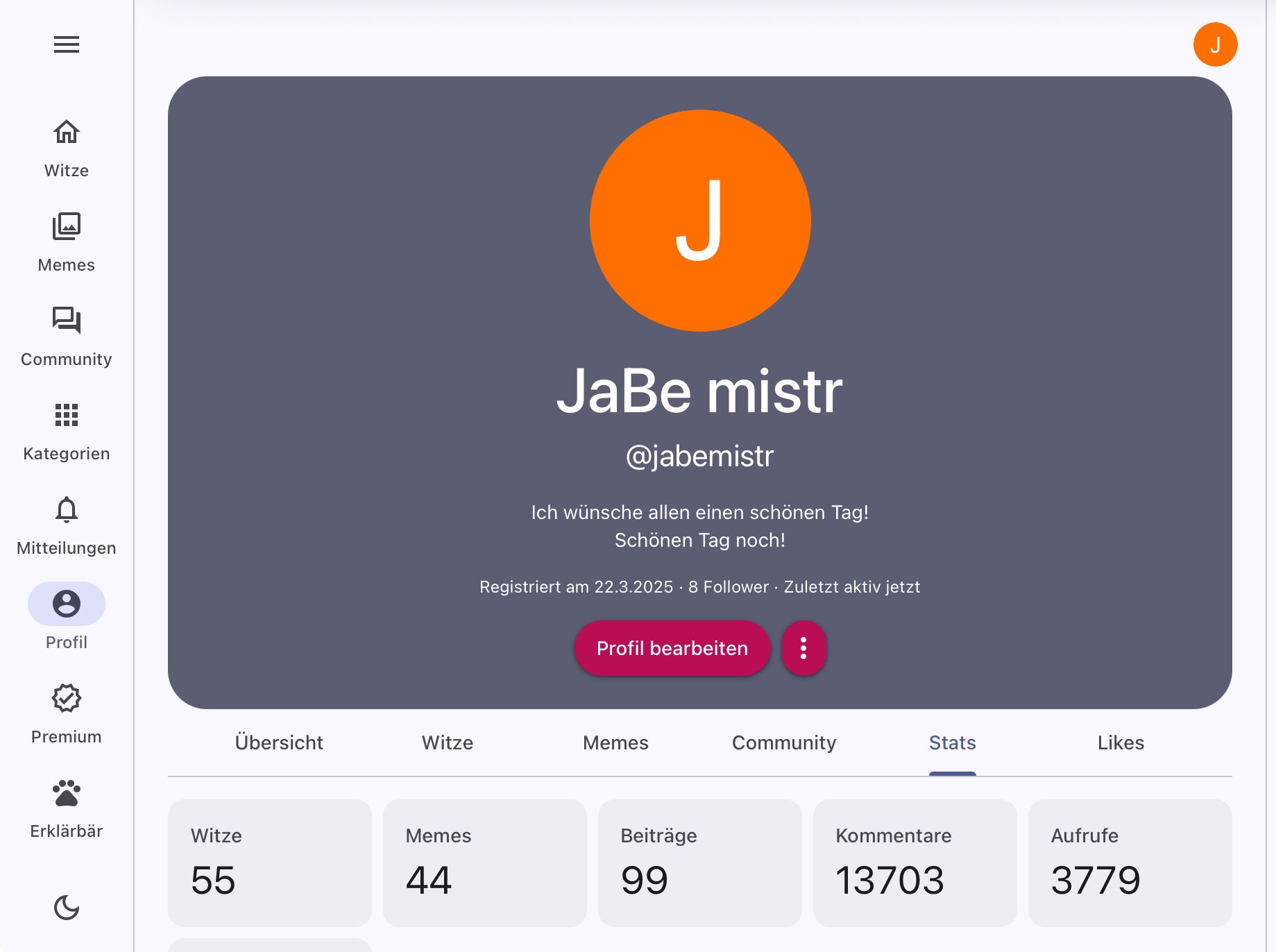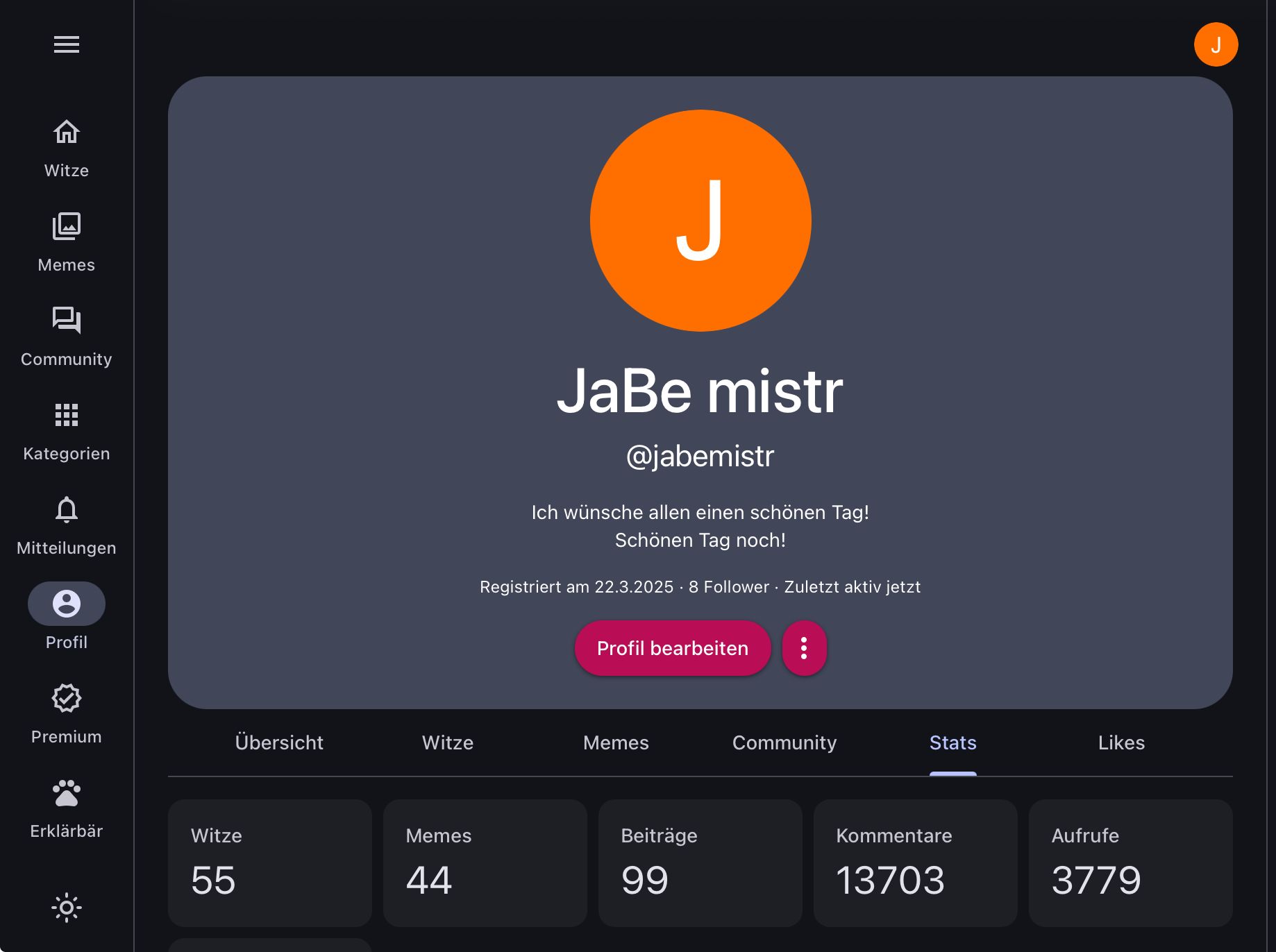 Leute! Ich habe es geschafft!🥳🥳🥳🥳 Ich habe wieder Schnapszahlen in meinen Stats! Kommentare zählen nur noch selten mit dazu da sie schon über 10000 liegen und eine Schnapszahl somit seltener zu erreichen ist. Außerdem zähle ich Aufrufe und Anzeigen auch nicht zu den Schnapszahlen! Ich habe jetzt 55 Witze 44 Memes und 99 Beiträge! Vielen Dnak für die bisherige schöne Zeit! Euer JaBe mistr!😃
