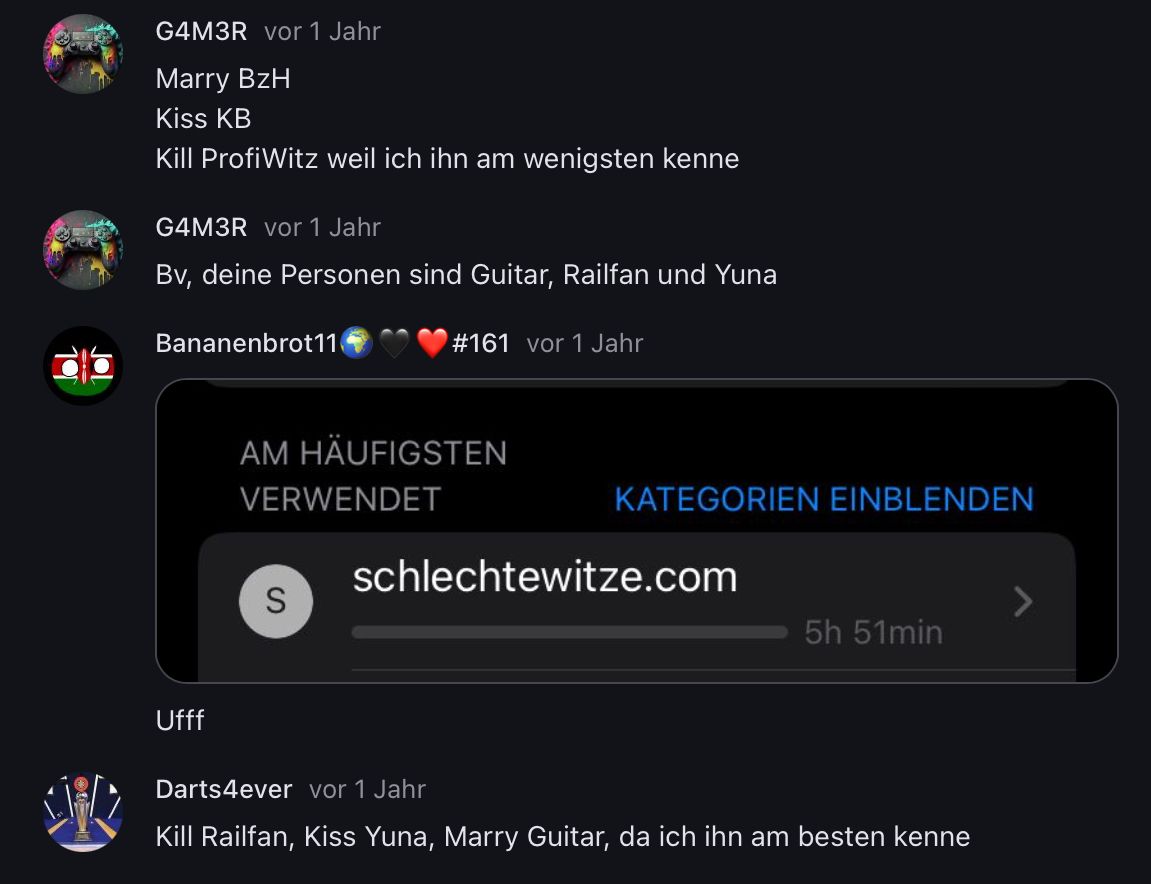 Kiss marry kill, die Auswahl war bösartig gestellt, ich habe das Ausschlussprinzip gewählt.