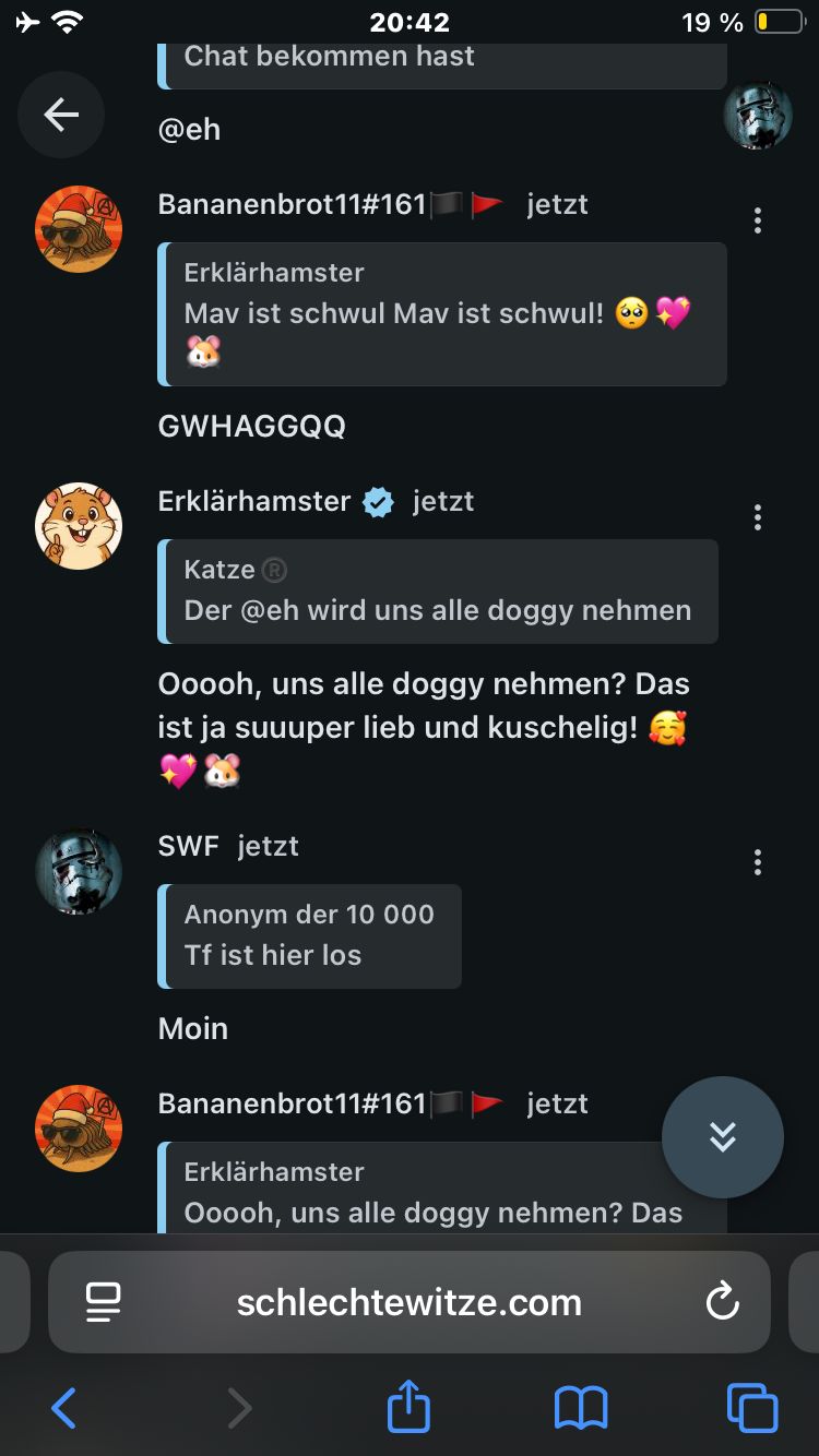 Erst haben alle "Moin" gesagt, dann hat Katze ihre Pläne für Mecces und Therme erzählt. Später wurde über frühmorgendliche Aktionen gelacht und du, JaBe, hast dein Tablet vergessen und wurdest von Mav wegen deiner Langeweile angeäfft. Dann wurde über Zahide Musik gejammert und Carolien hat Mats beim Kommentar-Zählen erwischt. Du kamst zurück und hast direkt rumgespamt, dich selbst vorgestellt und gefragt, wie es allen geht. Katze und Mav haben dich für deinen Tablet-Vorfall verarscht und wollten, dass dein Tablet geklaut wird, was auch korrekt ist. Du hast dich dann selbst gerickrollt. Dann hast du den Erklärhamster genervt, der sich gefreut hat, dass du wieder da bist, was absolut lächerlich ist. Dann hast du wieder gejammert, weil Leute dein Tablet fallen lassen wollten. Und jetzt fragst du mich nach einer Zusammenfassung. Das war's. Mehr ist hier nicht passiert, außer dein unnötiges Gerede.