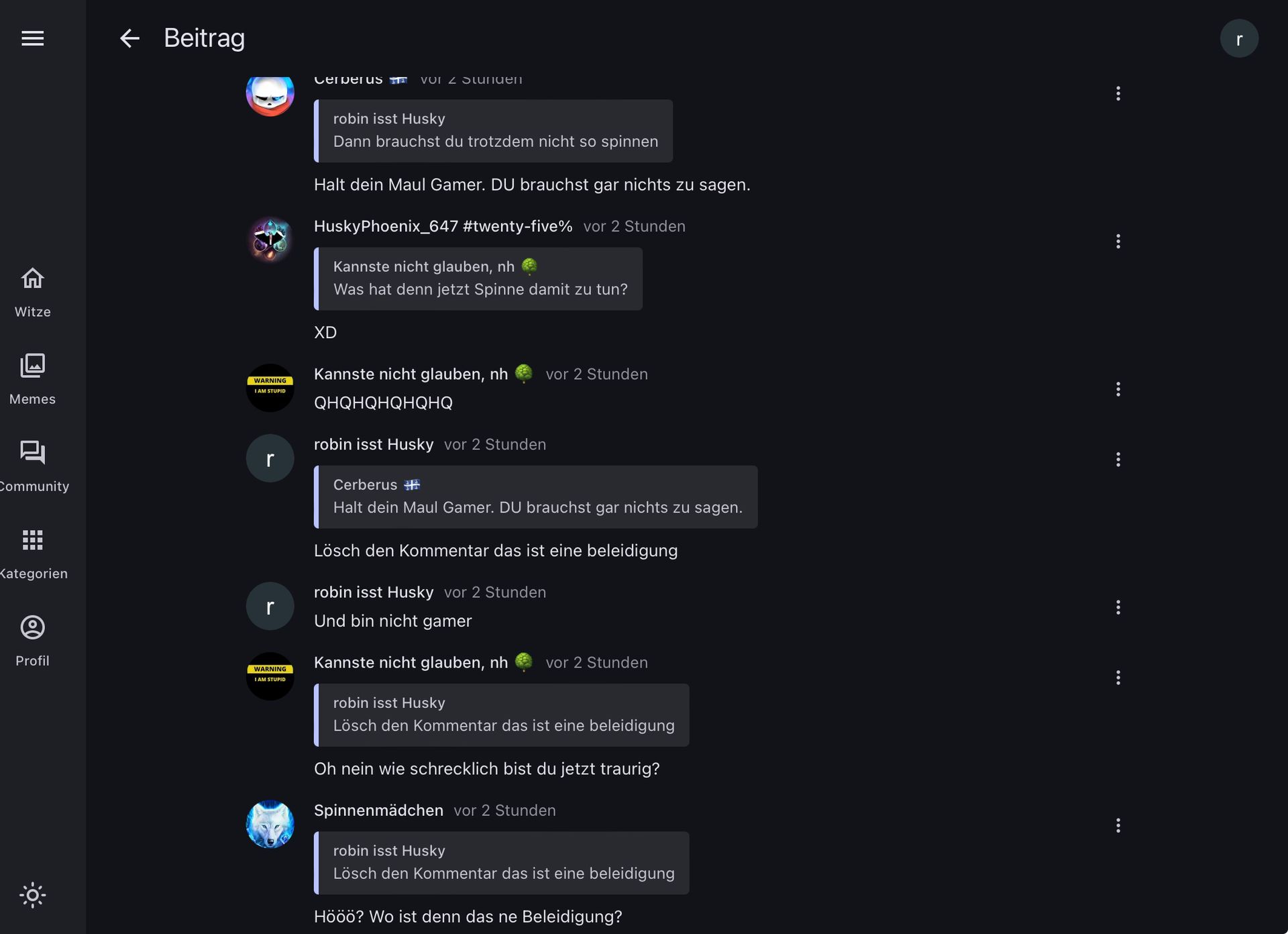 Serasvor 2 Jahrenrobin isst HuskyIch find das erstens nicht ok das cerberus mich beleidigt und noch weniger in Ordnung finde ich das die anderen sich darüber lustig machenWo machen sich andere darüber lustig?