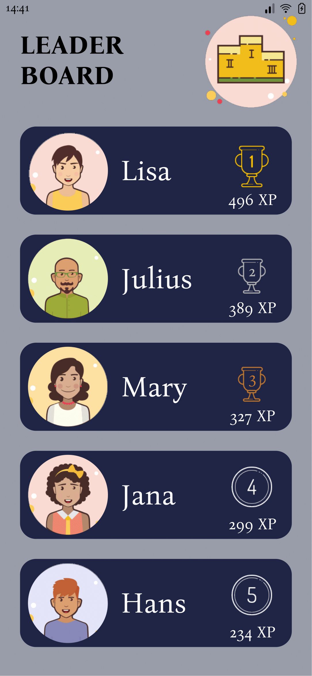Eine Bekannte entwickelt gerade eine App. Es geht darum, dass man Punkte und Achievements sammeln kann, wenn man Dinge tut, die einen weiterbringen. Über dieses Beispielbild mit den Avataren musste ich lachen... Bei Lisa, Jana und Hans fühlte ich mich schon sehr an diese Seite erinnert. Einen Julius gab es hier auch mal, aber der hatte nichts mit Spam, Fremdenfeindlichkeit oder Ekel zu tun. Sondern damit, Beleidigungen und Mobbing die Stirn zu bieten