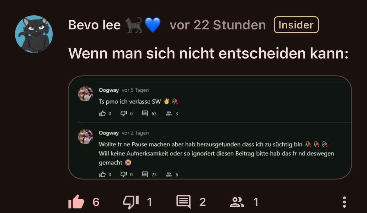Bevo (Wehendes Blatt)vor 9 Monaten🏳️🌈Drachi🐾#WaCa🐈⬛#Kotlc🦢Ich hab was was du nd hast:>Was hast du denn jetzt?