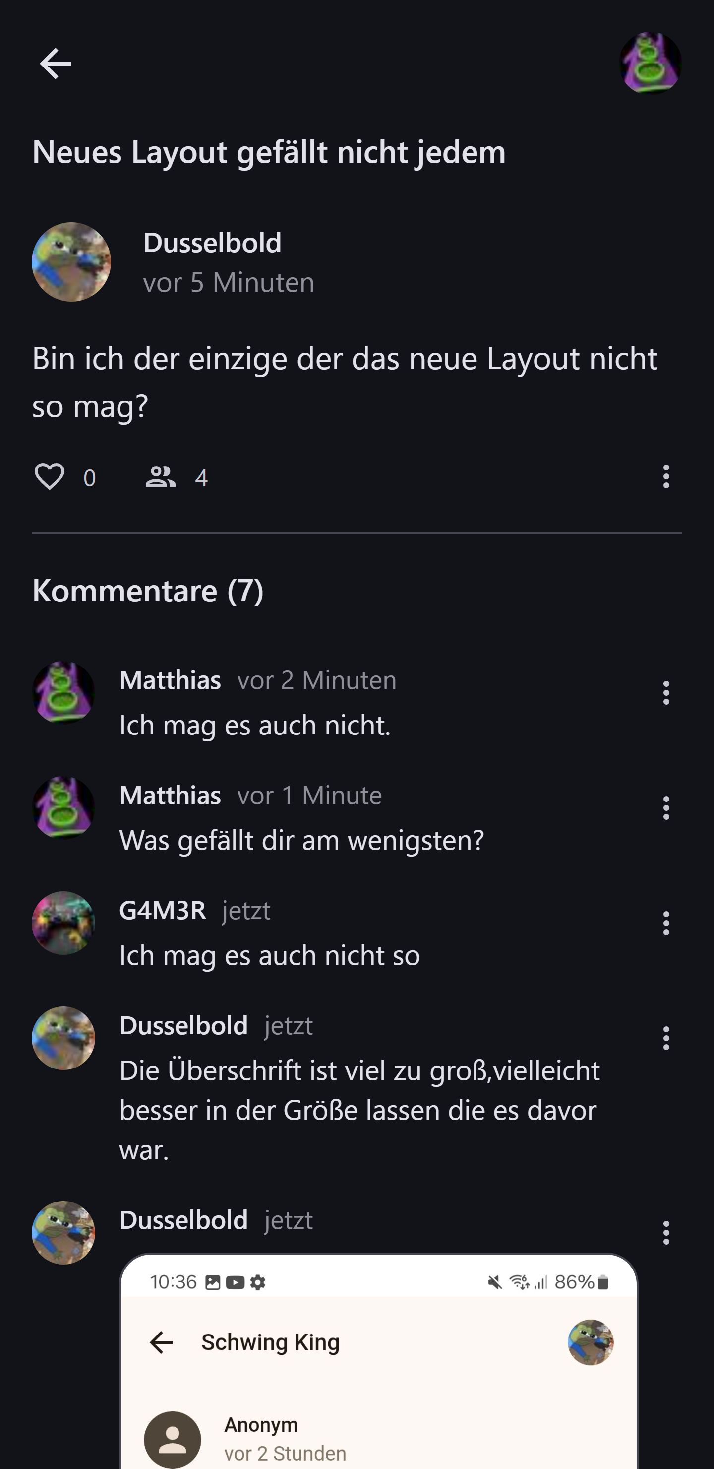 Außerdem sind die Profilbilder etwas zu klein geraten. Es sieht eher nach Antworten von einem Subkommentar aus, ansonsten es ist sowieso Gewöhnungssache.