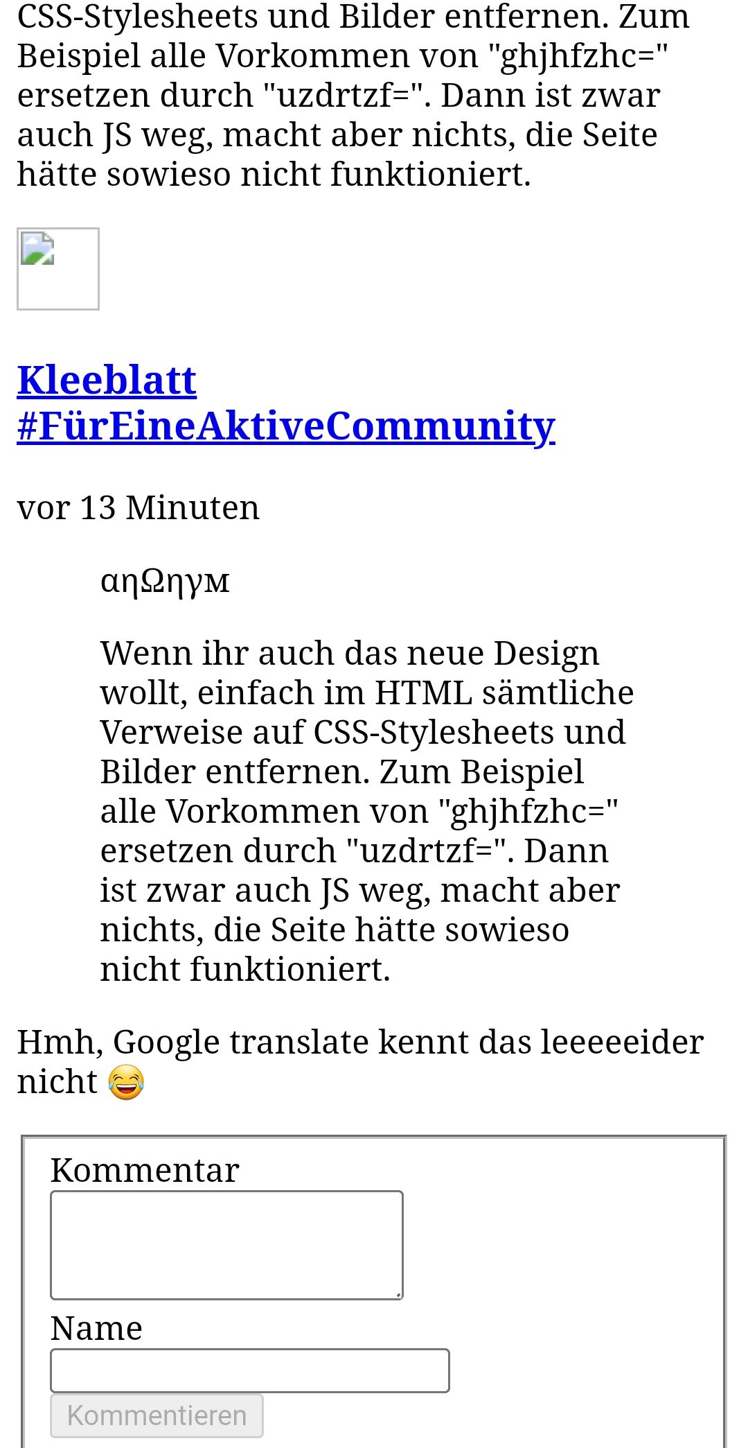 Wenn ihr auch das neue Design wollt, einfach im HTML sämtliche Verweise auf CSS-Stylesheets und Bilder entfernen. Zum Beispiel alle Vorkommen von "src=" ersetzen durch "uzdrtzf=". Dann ist zwar auch JS weg, macht aber nichts, die Seite hätte sowieso nicht funktioniert.