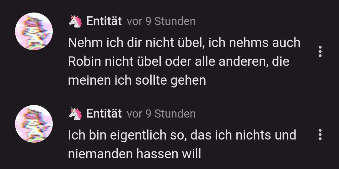 Entität, ich will dir sagen, dass mir diese ganze Geschichte echt leid tut und ich nicht will/wollte, dass du gehst. Ich finde dich ganz nett und du kannst mir wenn du willst auch erzählen was dich bedrückt.
