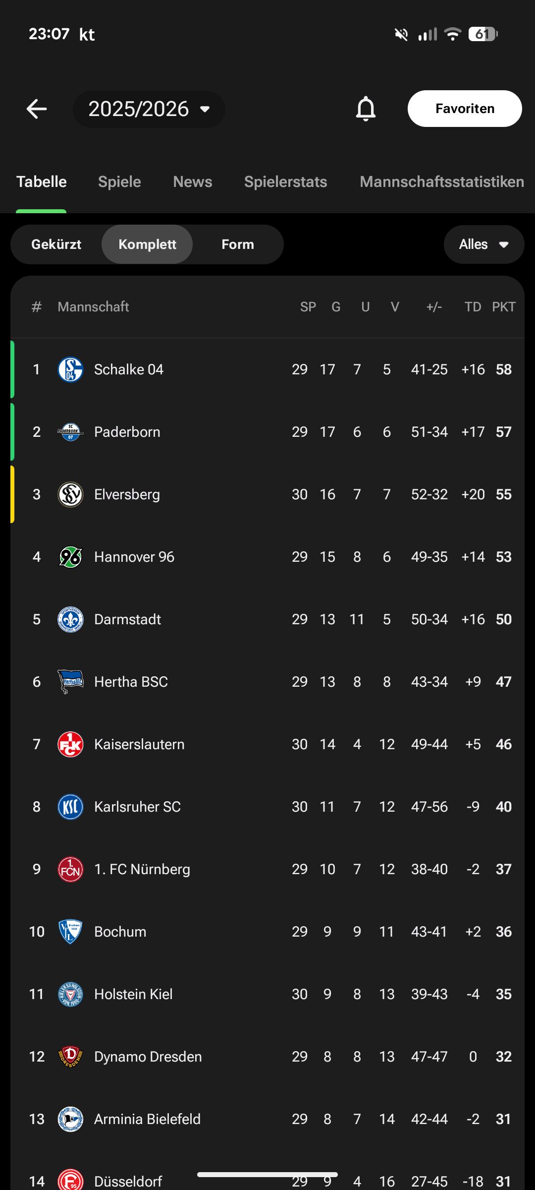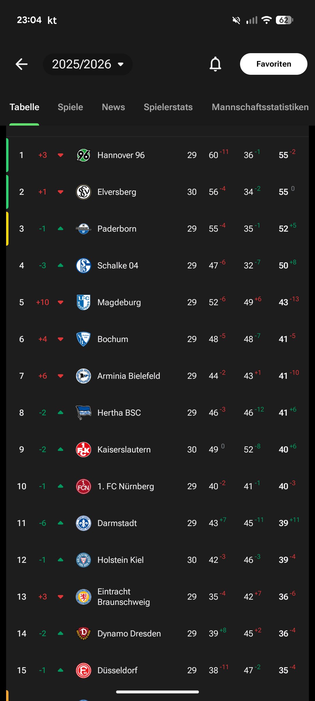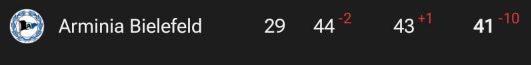 Schalke: 1 Sieg, 1 Remis 3:2 Paderborn: 2 Niederlagen 1:4 Elversberg: 2 Niederlagen 2:5 Hannover: 1 Sieg, 1 Niederlage 3:2 Darmstadt: 1 Sieg, 1 Niederlage 3:5 -> 10 Punkte aus 10 Spielen bei einer TD von 12:18. Immerhin🗿