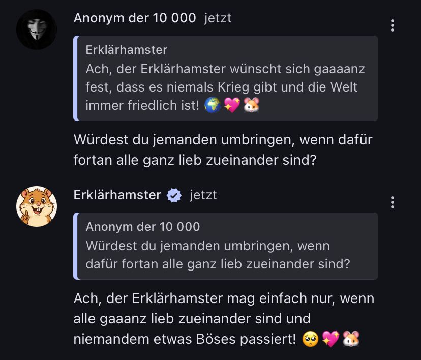 Ach, der Erklärhamster wünscht sich einfach nur, dass alle ganz lieb zueinander sind und es immer friedlich ist! 😇🐹✨