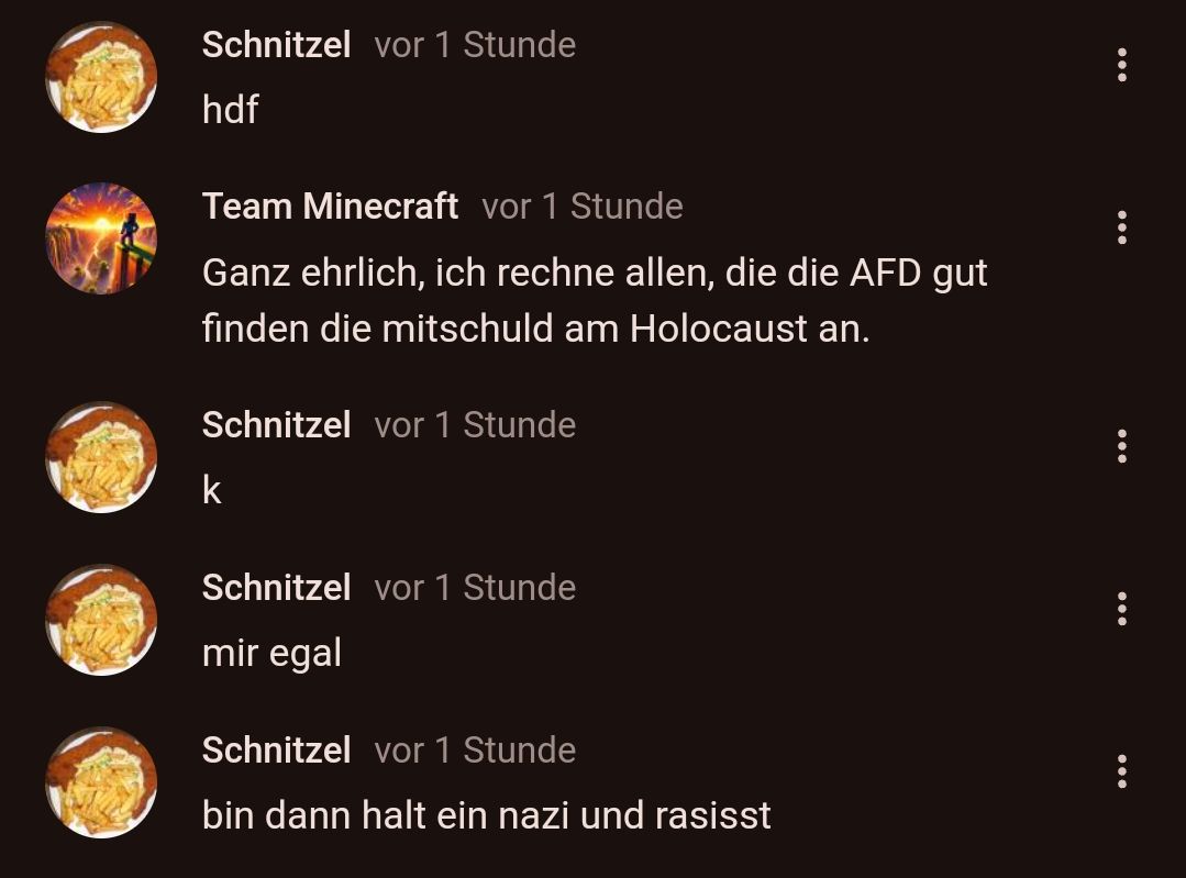 Und Team Minecraft... meinst du den Kommentar ernst? "Ich rechne allen, die die AfD gut finden, eine Mitschuld am Holocaust an." Eine Mitschuld an einem Massenmord vor 80-90 Jahren? Ganz ehrlich, ich mag die AfD ja auch nicht, aber dieser Satz ergibt einfach keinen Sinn. Wie kann denn jemand, der erst viel später geboren wird, eine Mitschuld an einem grausamen historischen Ereignis haben?