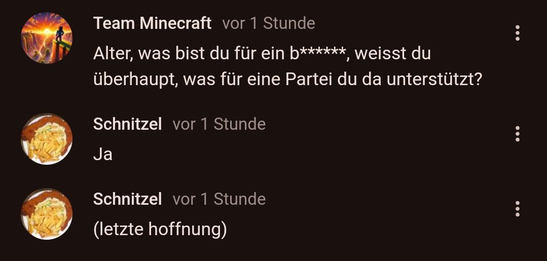 "Fick dich du dreckiges Arschloch und schäm dich dafür, dass du so eine Partei gut findest und das du es "OK" findest, dass du ein nazi bist, Schnitzel."
