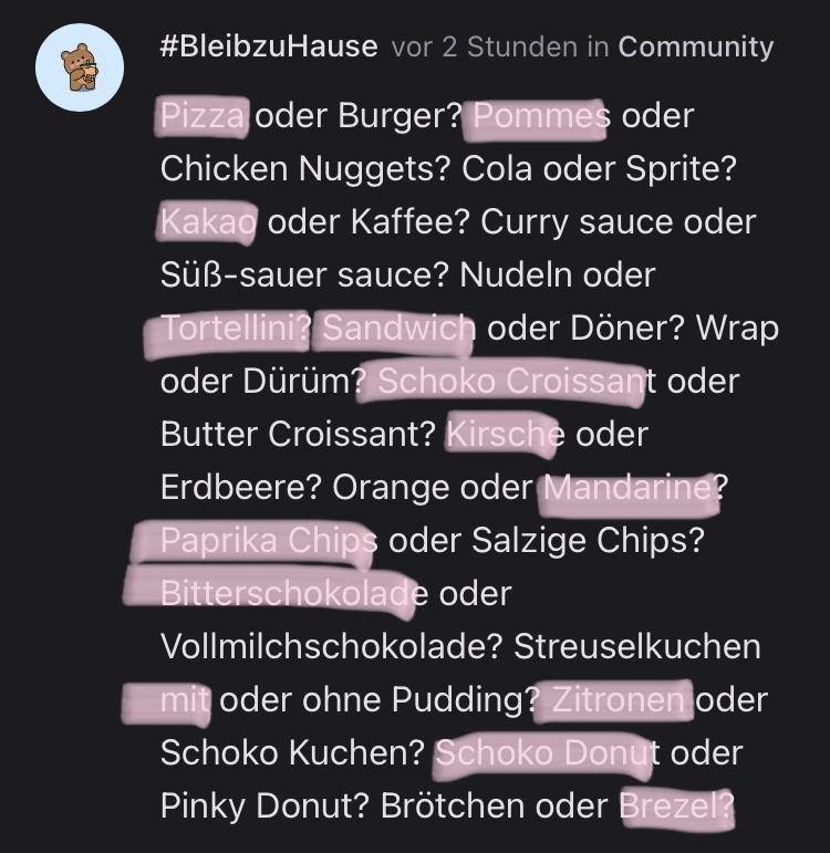 Pizza oder Burger? Pommes oder Chicken Nuggets? Cola oder Sprite? Kakao oder Kaffee? Curry sauce oder Süß-sauer sauce? Nudeln oder Tortellini? Sandwich oder Döner? Wrap oder Dürüm? Schoko Croissant oder Butter Croissant? Kirsche oder Erdbeere? Orange oder Mandarine?Paprika Chips oder Salzige Chips? Bitterschokolade oder Vollmilchschokolade? Streuselkuchen mit oder ohne Pudding? Zitronen oder Schoko Kuchen? Schoko Donut oder Pinky Donut? Brötchen oder Brezel?