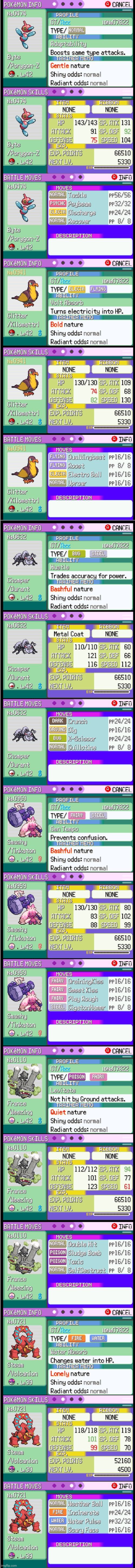 Und alle Pokémon inkl. deren mir bekannte Attacken der Top 4, so weit, wie ich kam.
