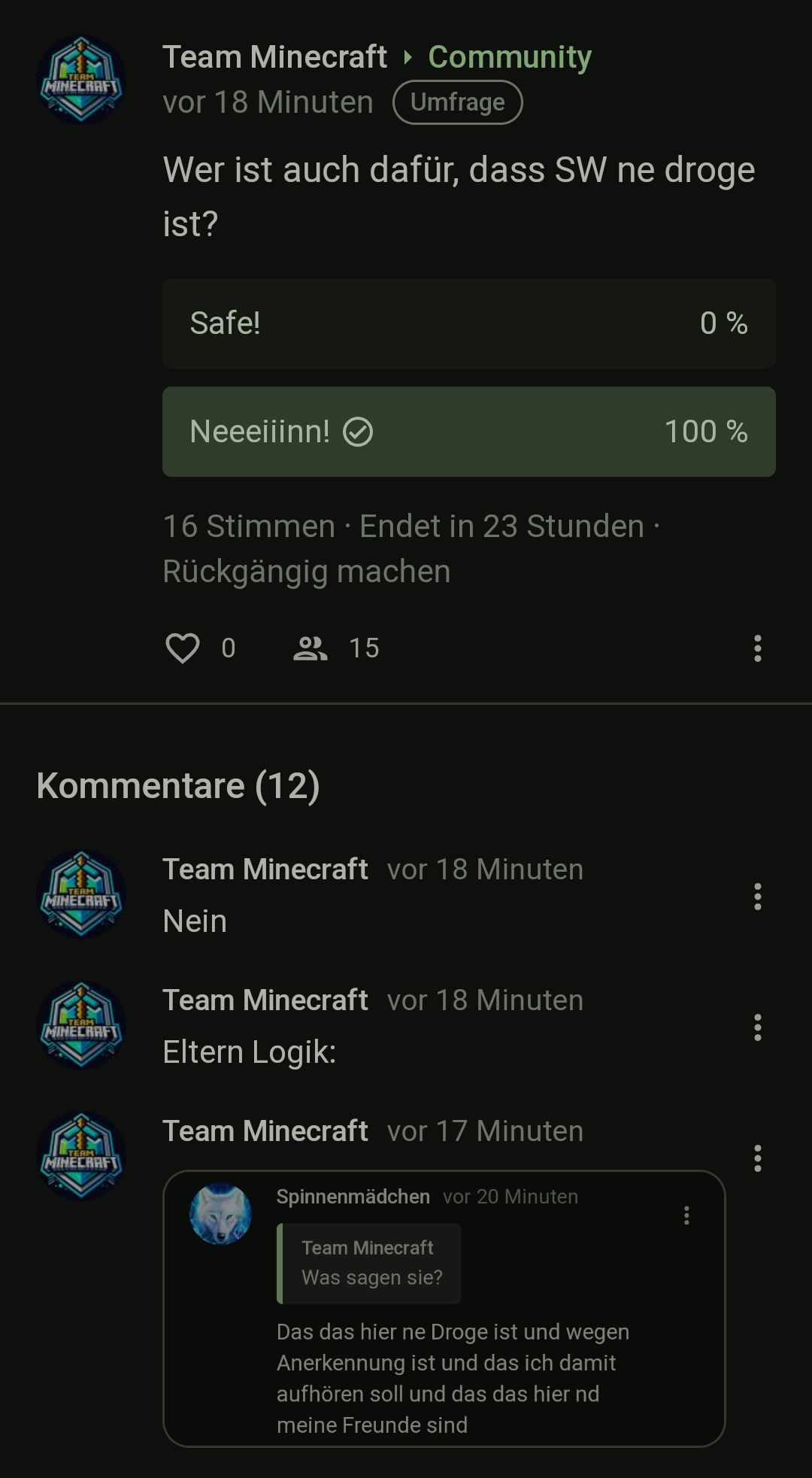 Mir stellt sich eher die Frage warum sie will dass das Profil und alle Kommentare von ihr gelöscht werden. Spinni: wir werden dich vermissen. Ich hoffe du hast Spaß im Rest deines Lebens.