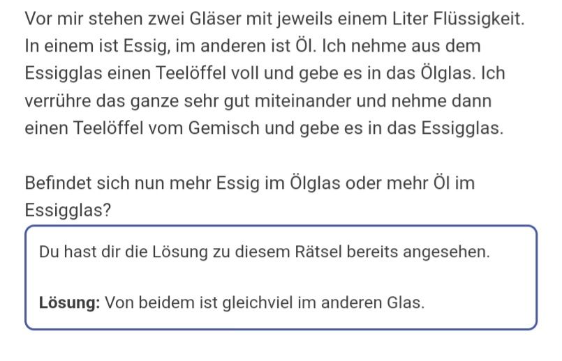 Rätselstunde: Vor mir stehen zwei Gläser mit jeweils einem Liter Flüssigkeit. In einem ist Essig, im anderen ist Öl. Ich nehme aus dem Essigglas einen Teelöffel voll und gebe es in das Ölglas. Ich verrühre das ganze sehr gut miteinander und nehme dann einen Teelöffel vom Gemisch und gebe es in das Essigglas.