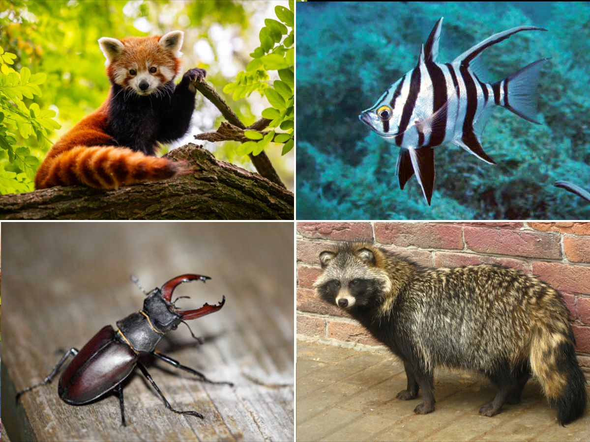 1. Roter Panda 2. Streifenbarsch 3. Hirschkäfer 4. Waschbär