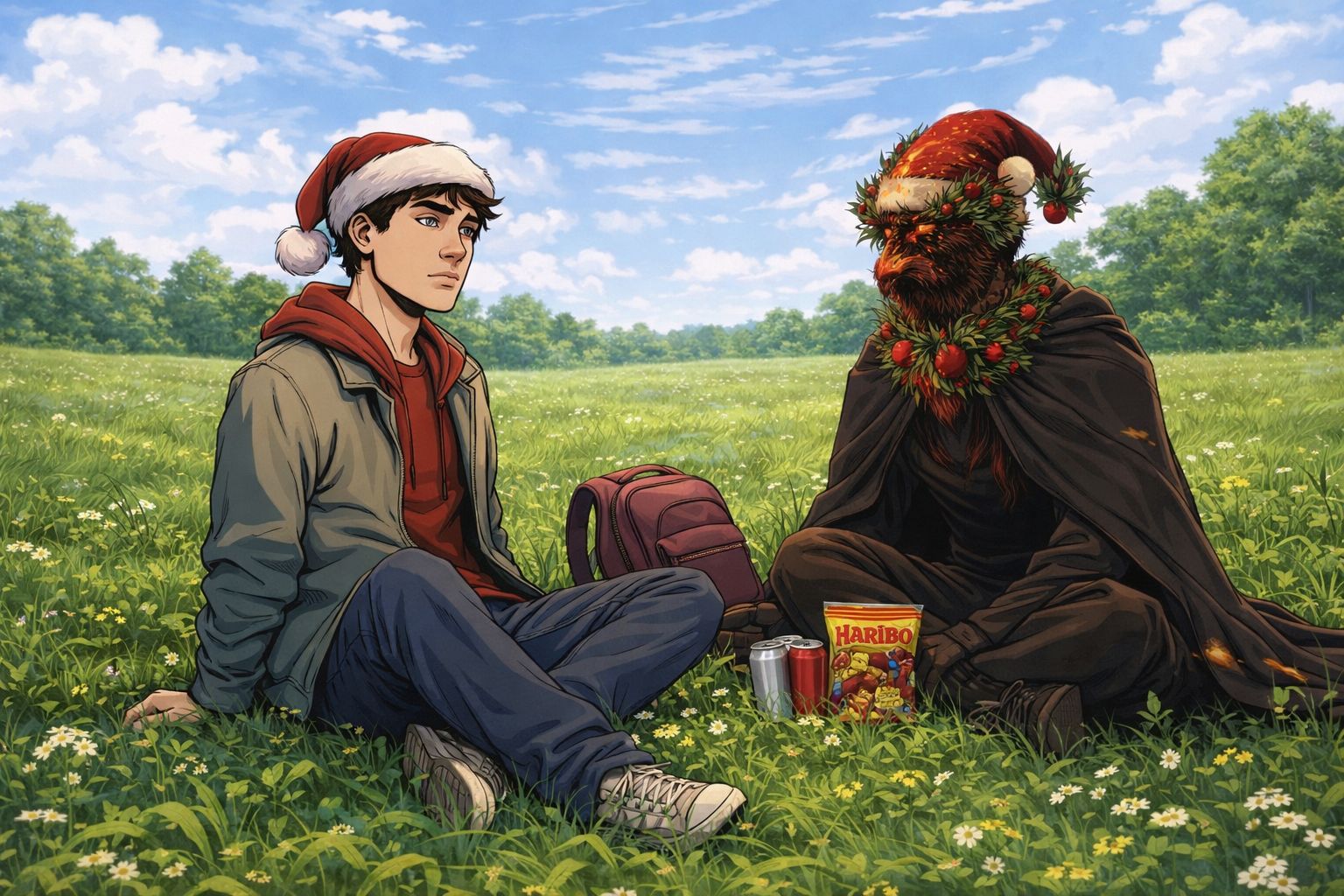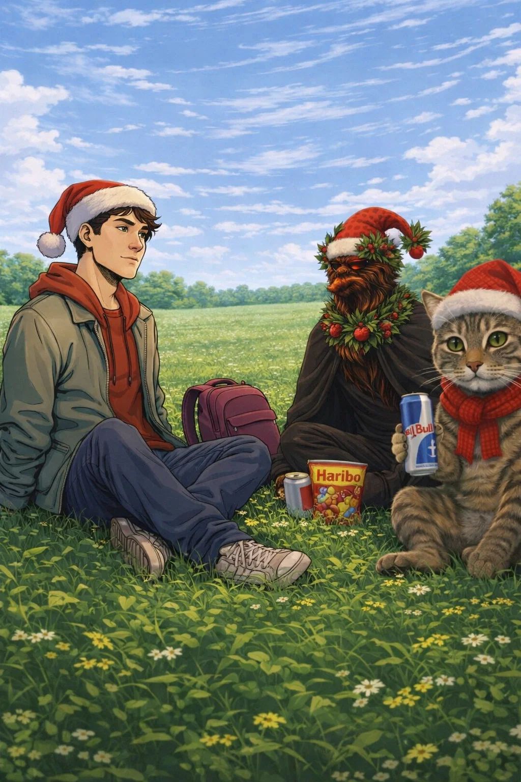 Dann ist der Faden komplett gekippt. Jemand hat die KI beauftragt, ein Bild von ihm und einem anderen User (*Colin*) beim Chillen mit Weihnachtsmützen, Haribo und einer Red Bull trinkenden Katze zu erstellen. Das kam besser an als die ganze Selbstreflexion.