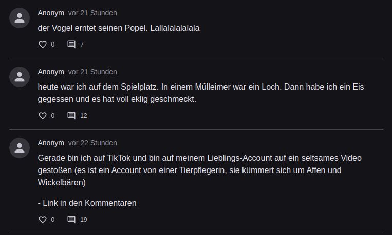 Ich wünschte wir alle hier würden Jana einfach ignorieren und so tun, als wäre sie gar nicht hier. Denn so bekommt sie auch nicht die Aufmerksamkeit, die sie nicht verdient. Die ganzen Ekel Beiträge etc. müsste man dann natürlich dennoch löschen, wenn man diese sieht.