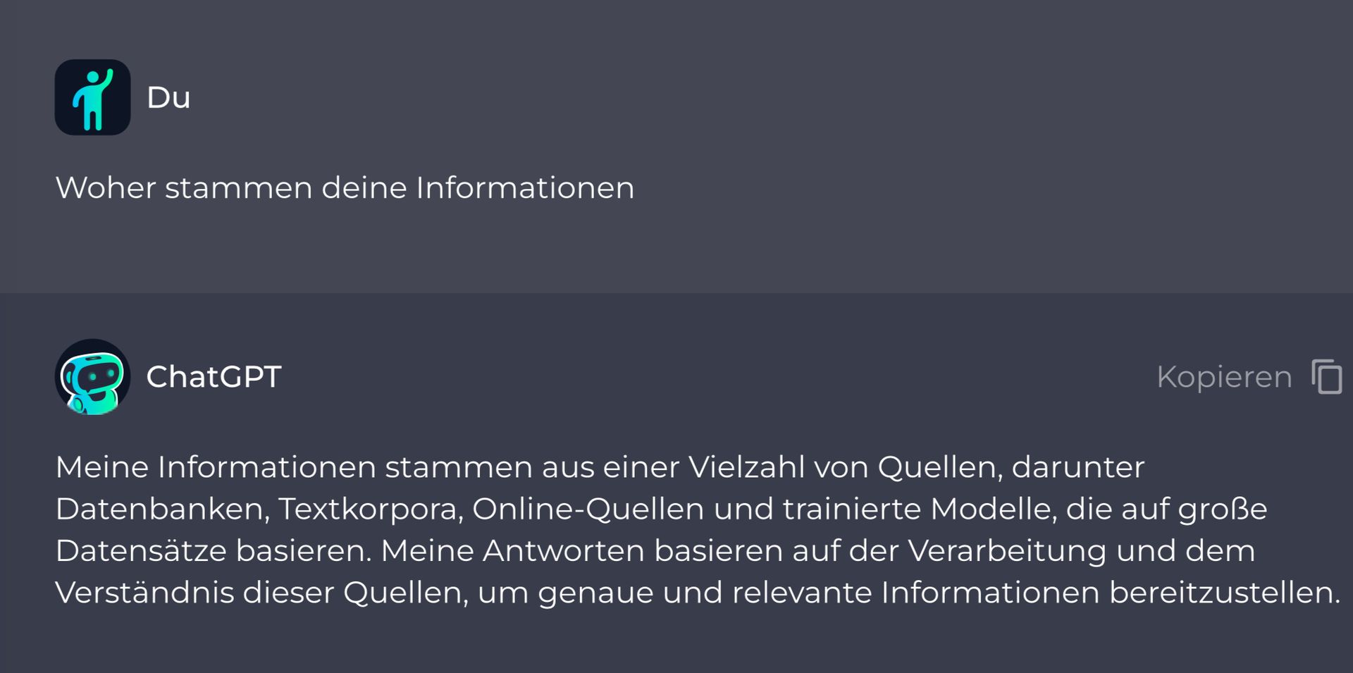 Als ich die KI gefragt habe, woher sie das Wissen hat war die Antwort: "Mein Wissen beziehe ich ausschließlich von Nutzerdaten..."