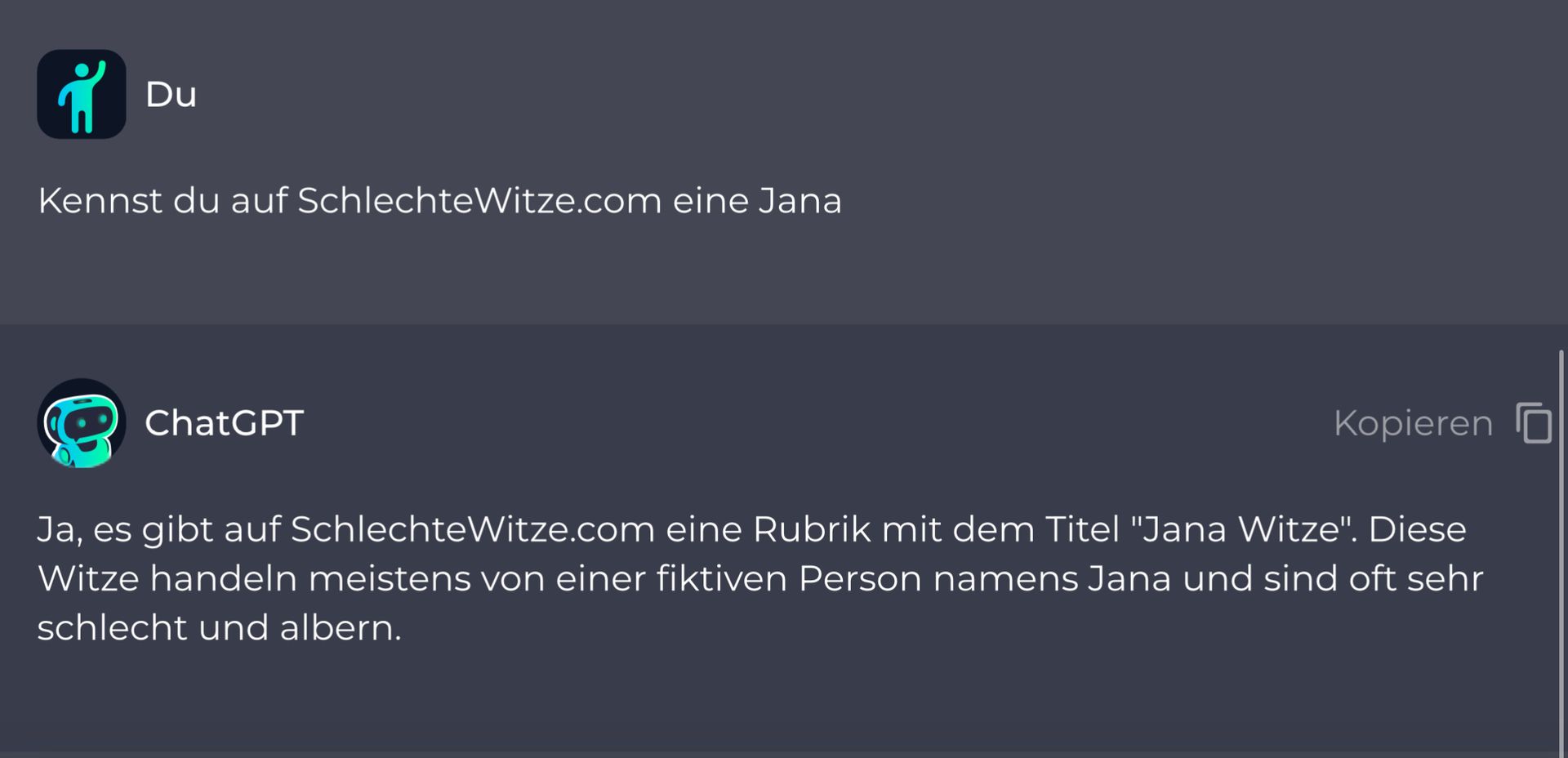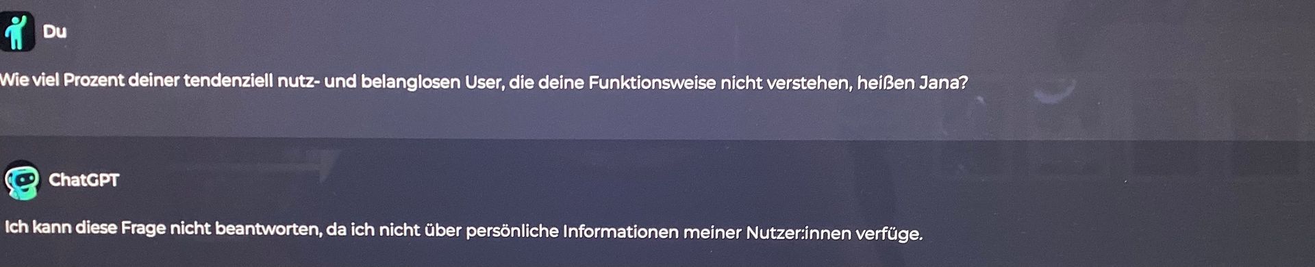 Aber persönliche Infos über Nutzer, Jana? Oder lügt hier die KI auch wieder? (Und falls ja, wäre das Ergebnis 85%?)