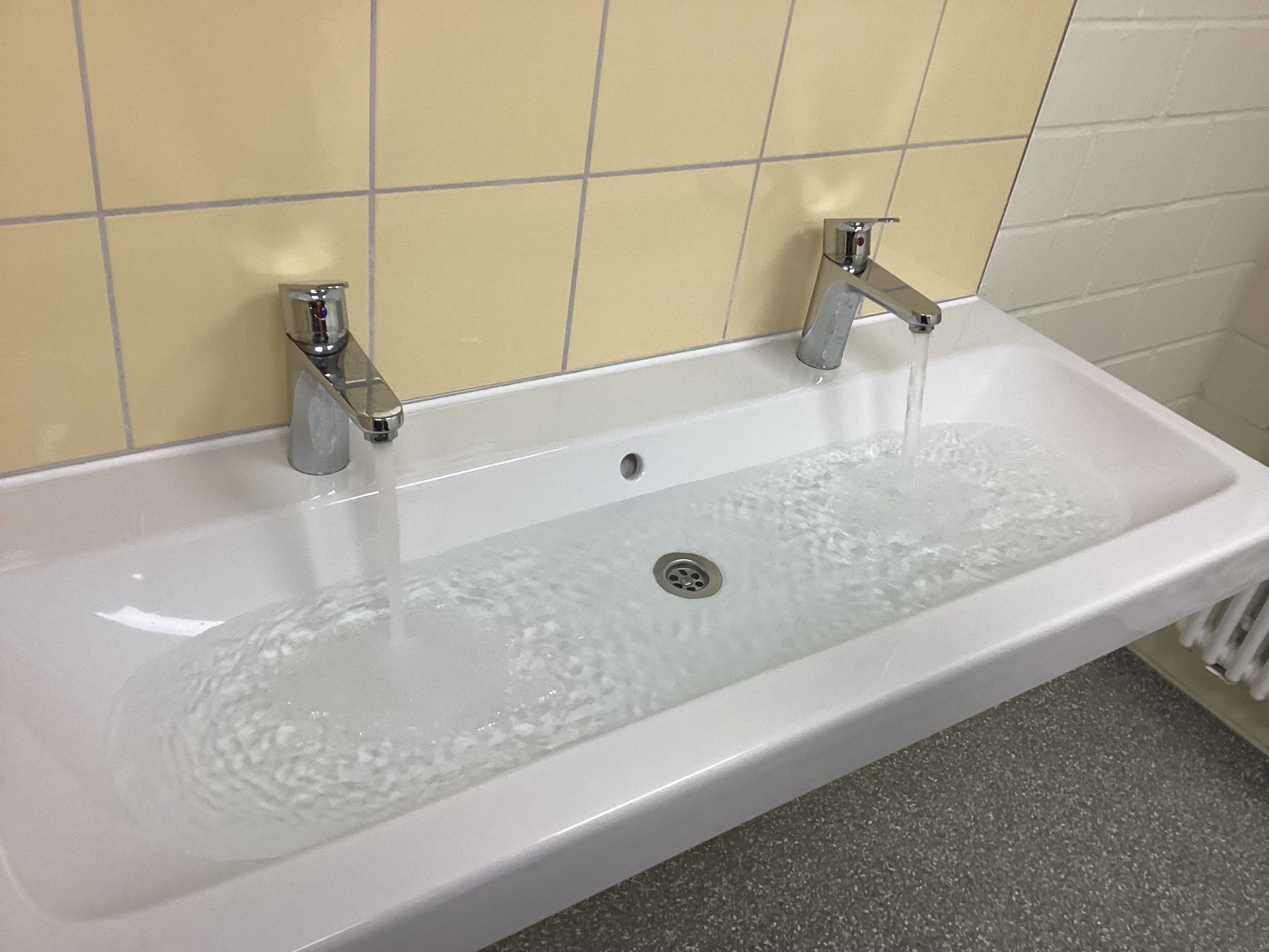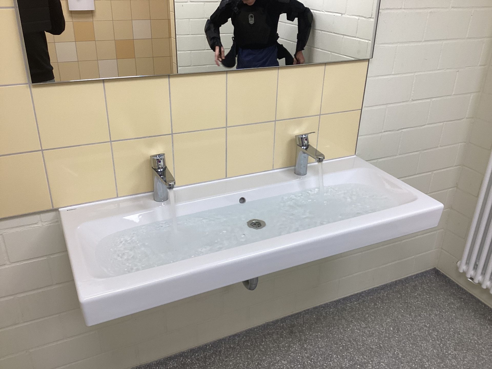 Das haben wir in der Schule in der Sportumkleide gemacht! Wir fanden es lustig wie es überläuft wenn man beide Wasserhähne voll aufgedreht