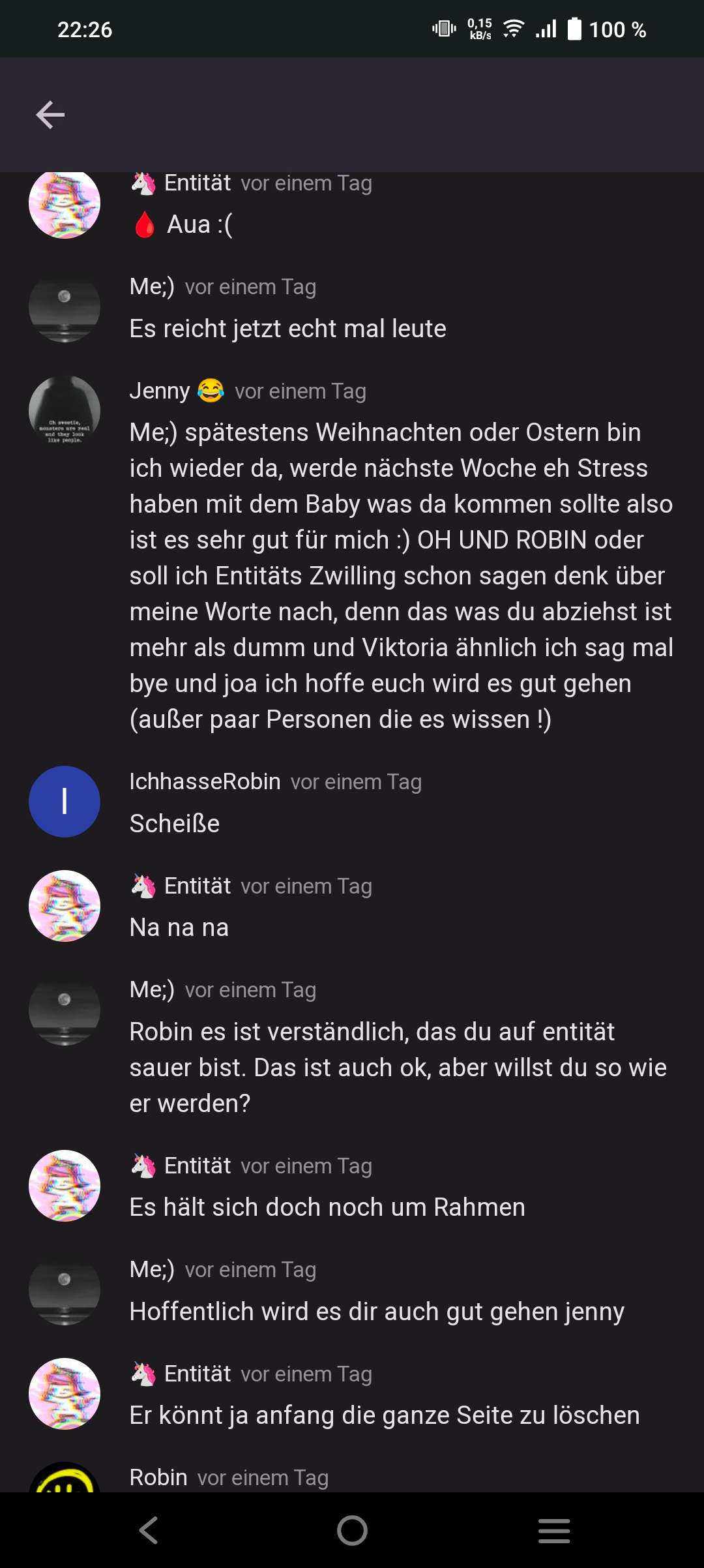 Jenny 😂 vor einem Tag Me;) spätestens Weihnachten oder Ostern bin ich wieder da, werde nächste Woche eh Stress haben mit dem Baby was da kommen sollte also ist es sehr gut für mich :) OH UND ROBIN oder soll ich Entitäts Zwilling schon sagen denk über meine Worte nach, denn das was du abziehst ist mehr als dumm und Viktoria ähnlich ich sag mal bye und joa ich hoffe euch wird es gut gehen (außer paar Personen die es wissen !)