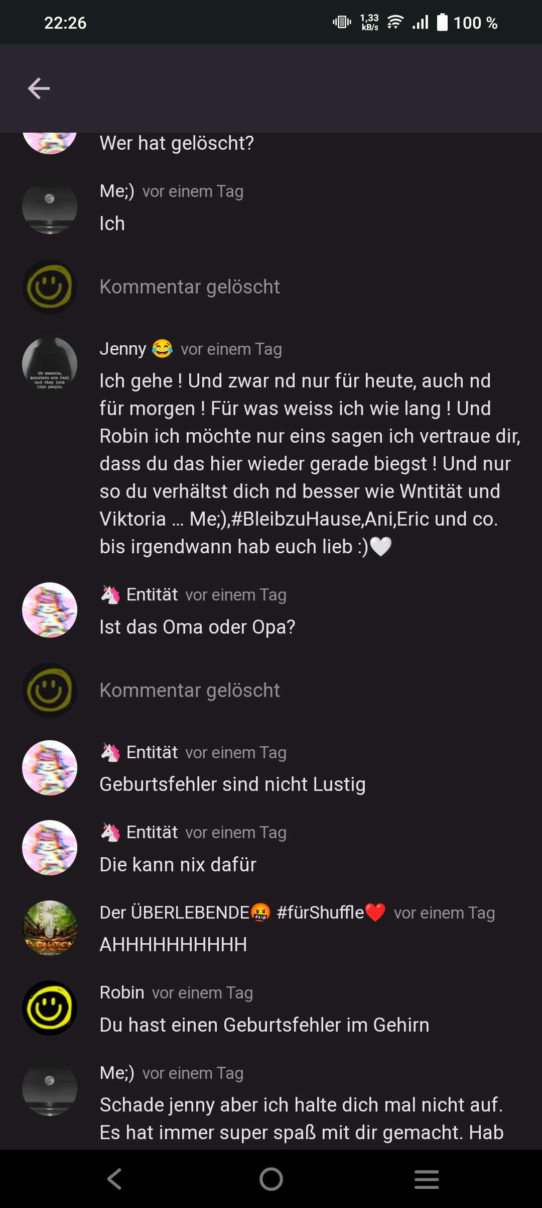 Jenny 😂 vor einem Tag Ich gehe ! Und zwar nd nur für heute, auch nd für morgen ! Für was weiss ich wie lang ! Und Robin ich möchte nur eins sagen ich vertraue dir, dass du das hier wieder gerade biegst ! Und nur so du verhältst dich nd besser wie Wntität und Viktoria … Me;),#BleibzuHause,Ani,Eric und co. bis irgendwann hab euch lieb :)🤍