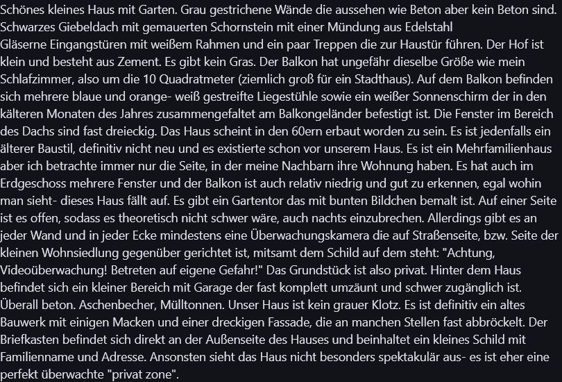 Schönes kleines Haus mit Garten. Grau gestrichene Wände die aussehen wie Beton aber kein Beton sind. Schwarzes Giebeldach mit gemauerten Schornstein mit einer Mündung aus Edelstahl Gläserne Eingangstüren mit weißem Rahmen und ein paar Treppen die zur Haustür führen. Der Hof ist klein und besteht aus Zement. Es gibt kein Gras. Der Balkon hat ungefähr dieselbe Größe wie mein Schlafzimmer, also um die 10 Quadratmeter (ziemlich groß für ein Stadthaus). Auf dem Balkon befinden sich mehrere blaue und orange- weiß gestreifte Liegestühle sowie ein weißer Sonnenschirm der in den kälteren Monaten des Jahres zusammengefaltet am Balkongeländer befestigt ist. Die Fenster im Bereich des Dachs sind fast dreieckig. Das Haus scheint in den 60ern erbaut worden zu sein. Es ist jedenfalls ein älterer Baustil, definitiv nicht neu und es existierte schon vor unserem Haus. Es ist ein Mehrfamilienhaus aber ich betrachte immer nur die Seite, in der meine Nachbarn ihre Wohnung haben. Es hat auch im Erdgeschoss mehrere Fenster und der Balkon ist auch relativ niedrig und gut zu erkennen, egal wohin man sieht- dieses Haus fällt auf. Es gibt ein Gartentor das mit bunten Bildchen bemalt ist. Auf einer Seite ist es offen, sodass es theoretisch nicht schwer wäre, auch nachts einzubrechen. Allerdings gibt es an jeder Wand und in jeder Ecke mindestens eine Überwachungskamera die auf Straßenseite, bzw. Seite der kleinen Wohnsiedlung gegenüber gerichtet ist, mitsamt dem Schild auf dem steht: "Achtung, Videoüberwachung! Betreten auf eigene Gefahr!" Das Grundstück ist also privat. Hinter dem Haus befindet sich ein kleiner Bereich mit Garage der fast komplett umzäunt und schwer zugänglich ist. Überall beton. Aschenbecher, Mülltonnen. Unser Haus ist kein grauer Klotz. Es ist definitiv ein altes Bauwerk mit einigen Macken und einer dreckigen Fassade, die an manchen Stellen fast abbröckelt. Der Briefkasten befindet sich direkt an der Außenseite des Hauses und beinhaltet ein kleines Schild mit Familienname und Adresse. Ansonsten sieht das Haus nicht besonders spektakulär aus- es ist eher eine perfekt überwachte "privat zone".