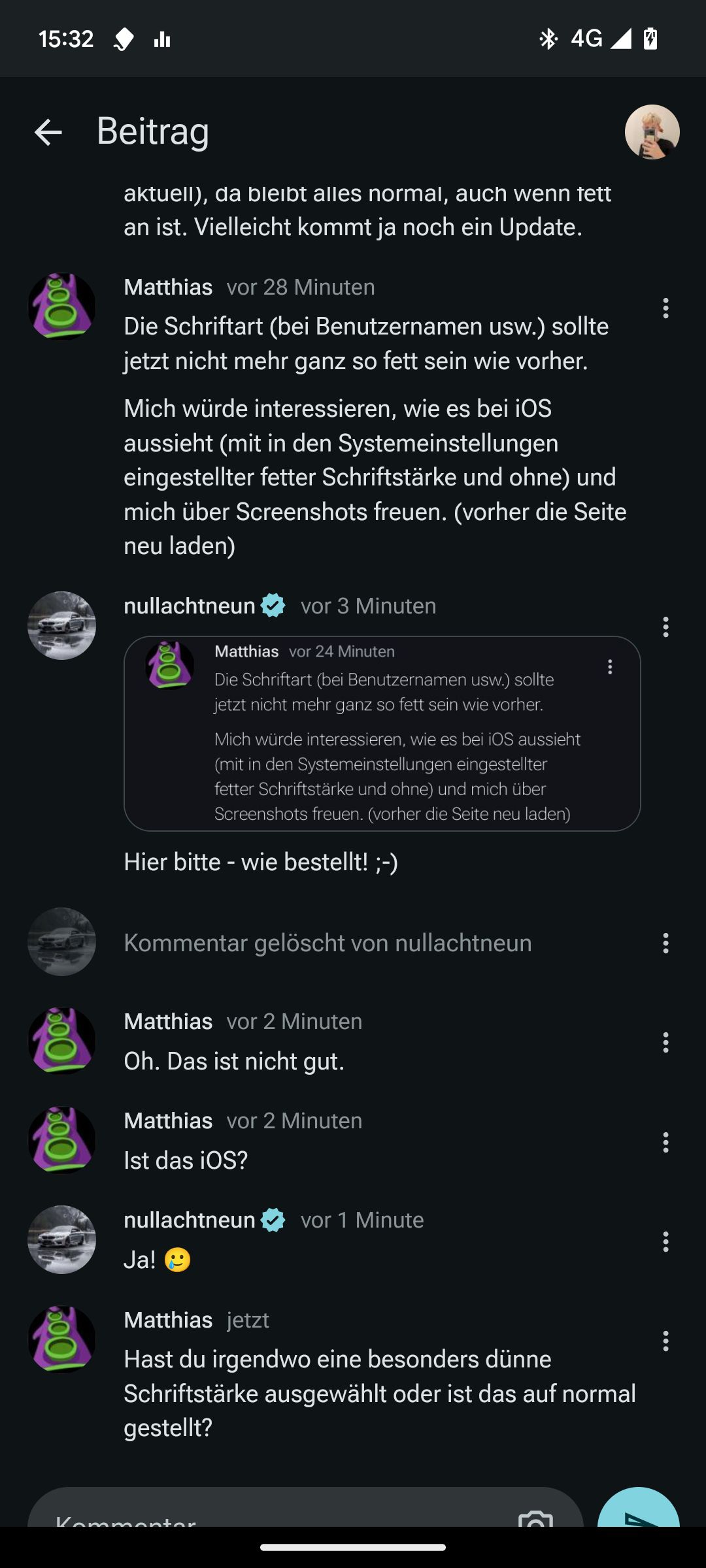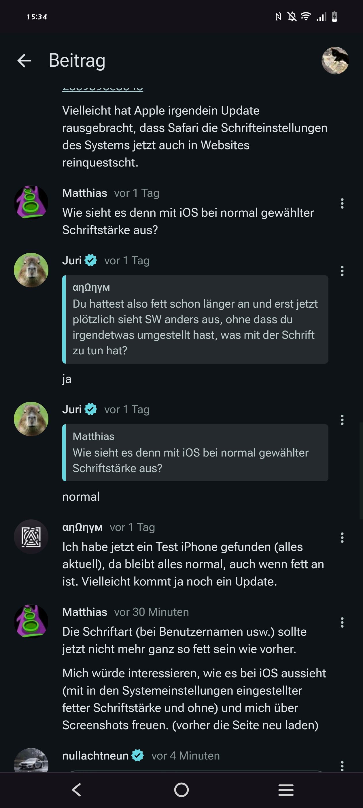 Mich würde interessieren, wie es bei iOS aussieht (mit in den Systemeinstellungen eingestellter fetter Schriftstärke und ohne) und mich über Screenshots freuen. (vorher die Seite neu laden)