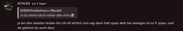 "ja bei den meisten leuten bin ich eif ehrlich und sag dann halt spass aber bei wenigen ist es fr spass, und da gehörst du nicht dazu"