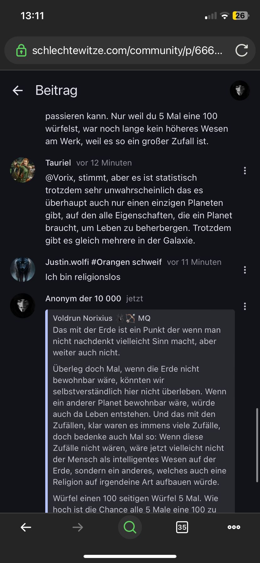 Ich liebe es, das Diskussionen zwischen nicht-Christen und Christen in den meisten Fällen so sachlich und fair bleiben. Also das niemand irgendwie anfängt zu beleidigen oder so, auf keiner Seite