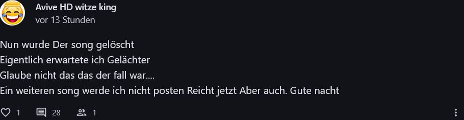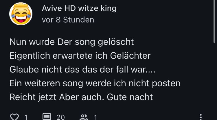 Nun wurde Der song gelöscht Eigentlich erwartete ich Gelächter Glaube nicht das das der fall war.... Ein weiteren song werde ich nicht posten Reicht jetzt Aber auch. Gute nacht
