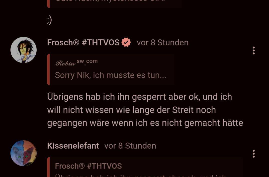 Und Nik wurde ja erst gesperrt als ich kurz dazukam, Robin hätte ihn schon die ganze Zeit sperren können, weil er war ja die ganze Zeit über da war auch als Nik beleidigt hat