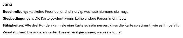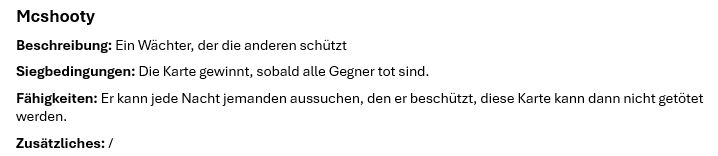 Name: Slay - Hinterhältiger Teufel (idk den Namen kann man natürlich umbenennen) Beschreibung: Schleimt sich ein und greift dann an, sehr hinterhältig Siegbedingungen: Sie gewinnt, wenn sie als letztes übrigbleibt Fähigkeiten: Votet niemanden raus, aber kann jede Nacht eine Person umbringen (kann durch andere Karten mit speziellen Fähigkeiten aufgehoben werden) Zusätzliches: Darf ausserdem ganz am Anfang eine Person aussuchen (also geheim natürlich), die einen Tipp abgeben darf, wer die Slay-Karte hat, wenn die ausgewählte Person stirbt