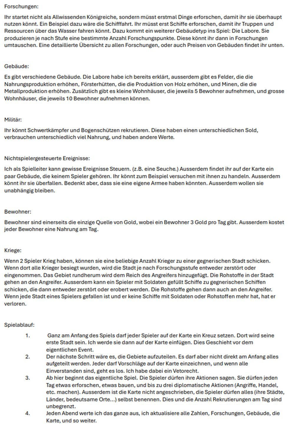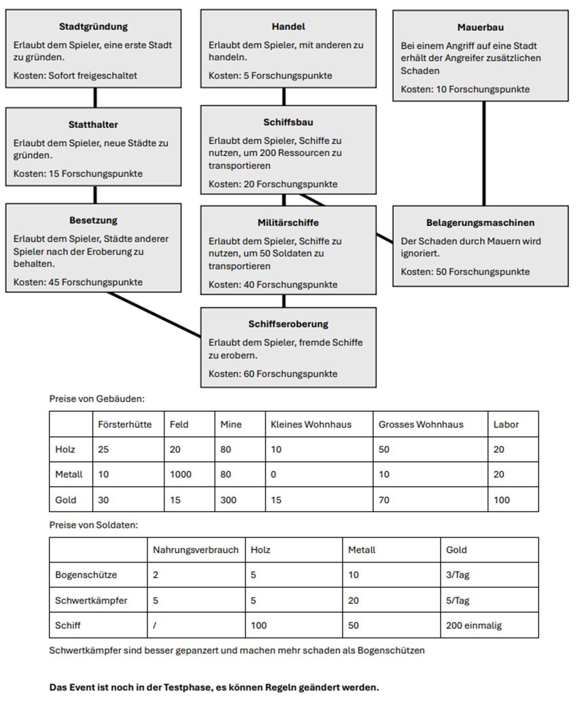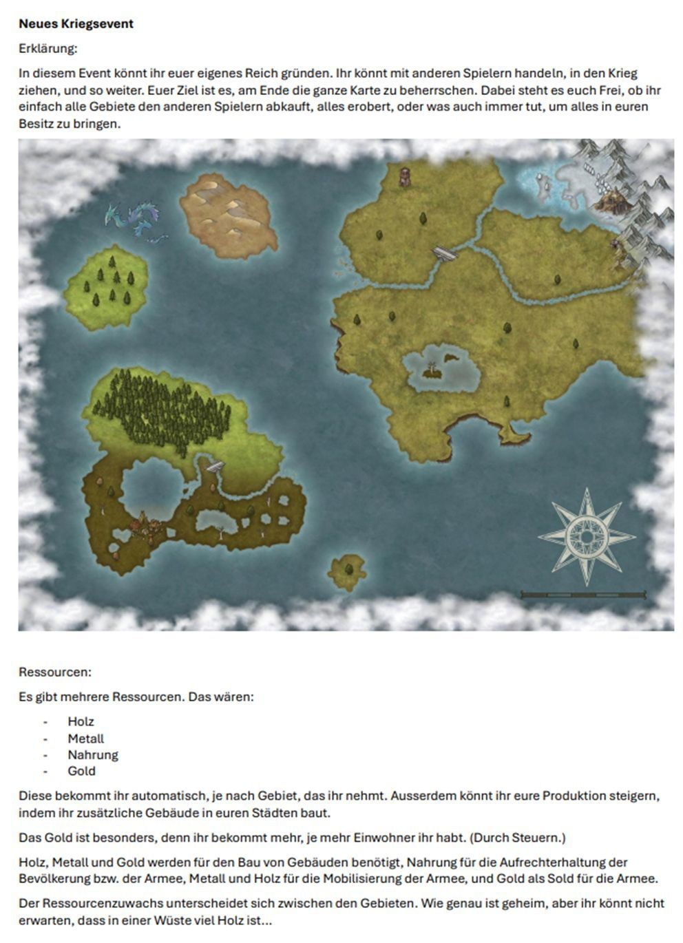 Also, dann startet das Kriegsevent jetzt. Ihr könnt bis morgen Abend sagen, was ihr macht, dann werte ich es aus. Die aktuelle Karte und die Daten eurer Städte sind in den Kommentaren. Bei Fragen entweder die Regeln lesen oder mich Fragen. Wenn ihr irgendwelche Verhandlungen führt, dann macht das bitte z.B. in einem Chat oder irgendwo Privat. Hier am besten nur die Aktion ausführen, bei Handel und so weiter müssen aber alle beteiligten hier zustimmen. Danke und viel Spass.