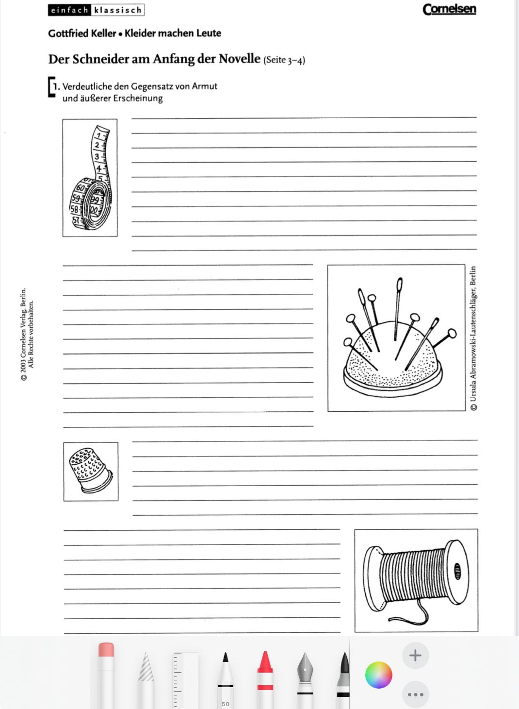 Aufgabe: „Verdeutliche den Gegensatz von Armut und äußerer Erscheinung“ (bezogen auf den Schneider am Anfang der Novelle, Seiten 3–4).