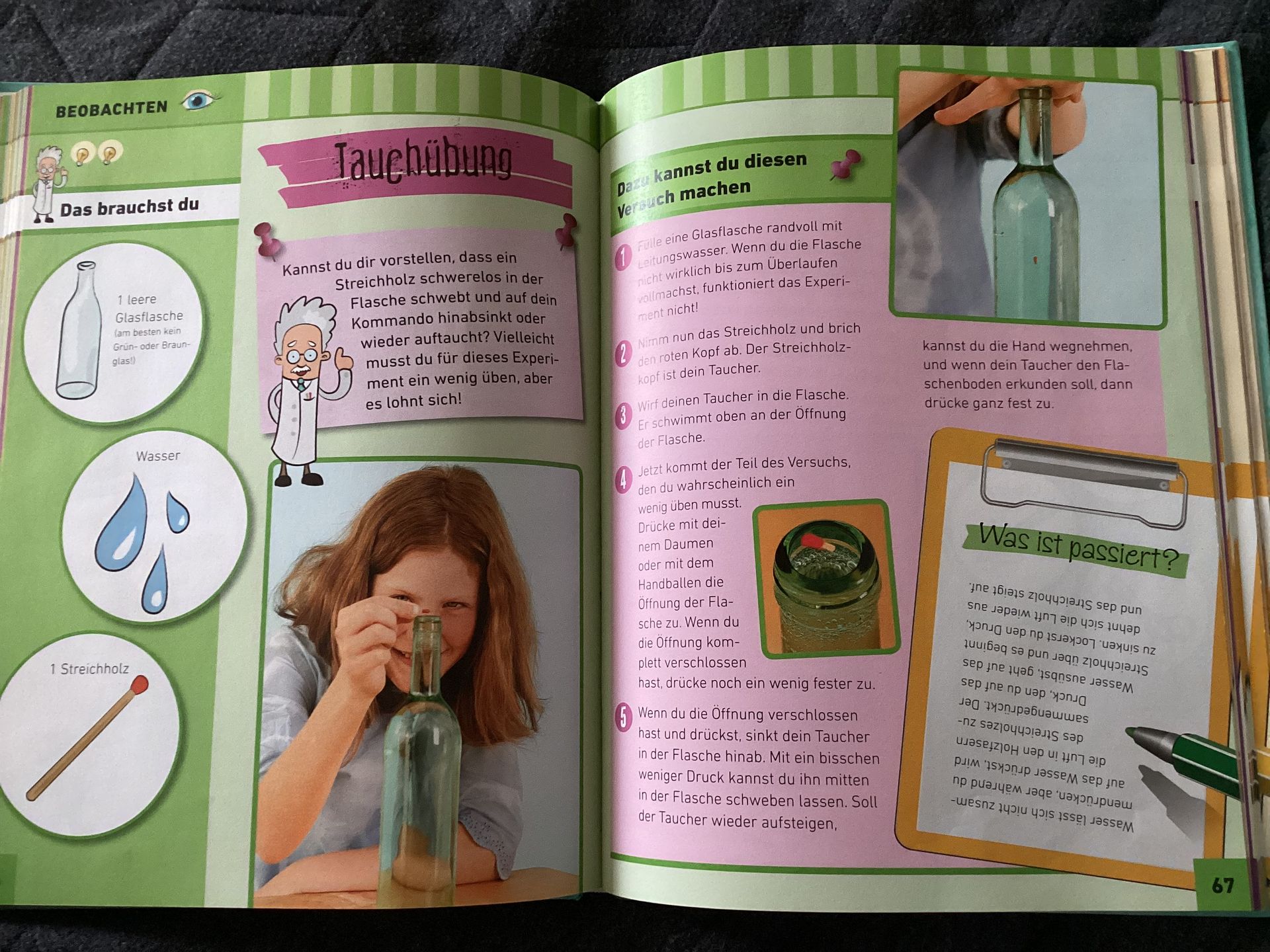 Habe noch so ein Experimente-Buch von früher zu Rate gezogen, hier drei Beispiele daraus. Die Auswertung ist zwar ziemlich schwach, aber die Effekte kann man ganz gut mit wissenschaftlichem Hintergrundwissen ausstaffieren